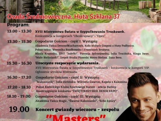 To już XXIV edycja tego wielkiego święta truskawki i XVII -sta zmagań w szypułkowaniu a więc pozbawianiu dorodnych owoców zielonych końcówek. Impreza odbywaj się w Osadzie Średniowiecznej w Hucie Szklanej.