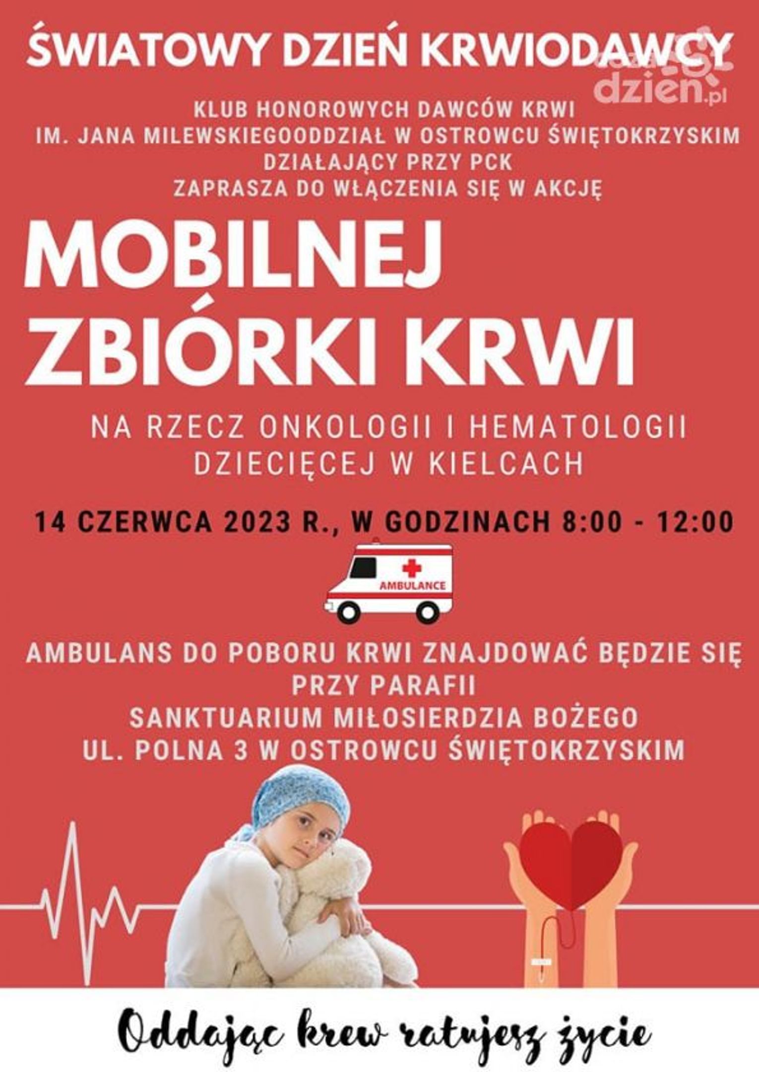 14 czerwca obchodzony jest Światowy Dzień Krwiodawcy. Dzień ten jest wyjątkową okazją do podniesienie świadomości potrzeby zapewnienia krwi, ale także wsparcia publicznej służby krwi. Z tej okazji w Ostrowcu Świętokrzyskim odbędzie się mobilna zbiórka tego bezcennego leku.