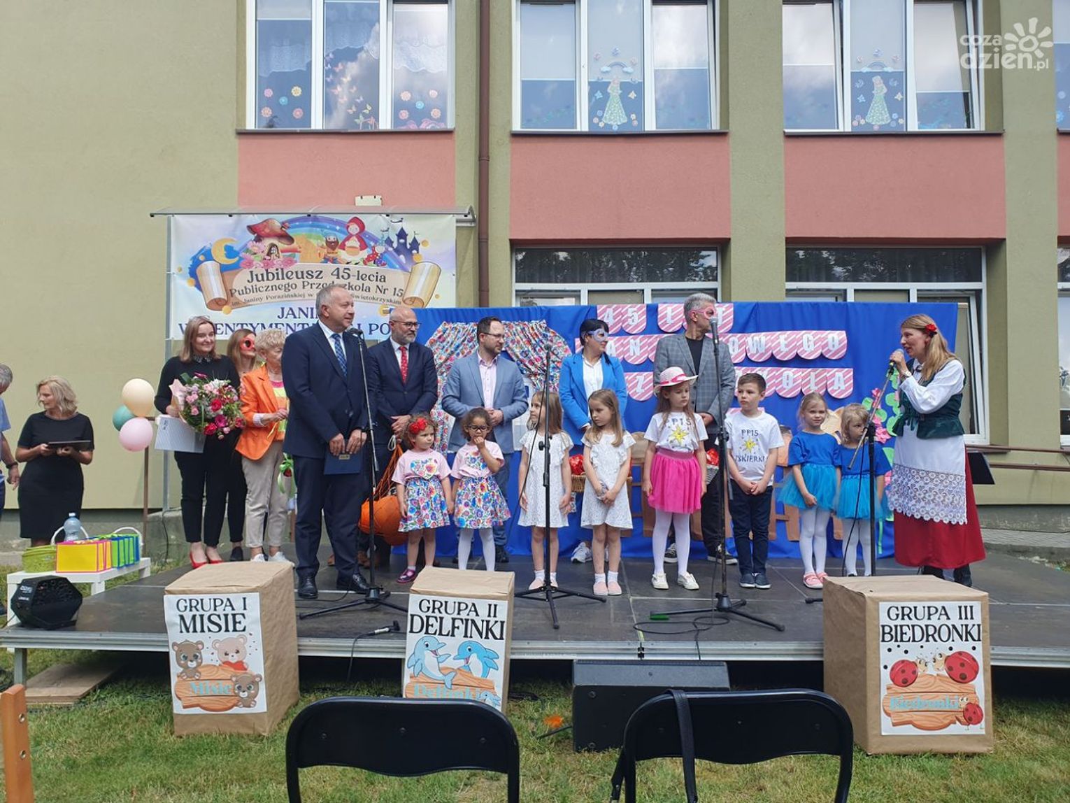 Dyrektor przedszkola Edyta Kowalska serdecznie dziękuje wszystkim gościom przybyłym na uroczystość, jest wdzięczna za obecność w jubileuszowych obchodach władzom miasta. Wspólnie z obecnymi i byłymi przedszkolakami, rodzicami oraz kadrą i dyrekcją świętowali m.in. wiceprezydent Artur Łakomiec oraz wiceprezydent Dominik Smoliński.