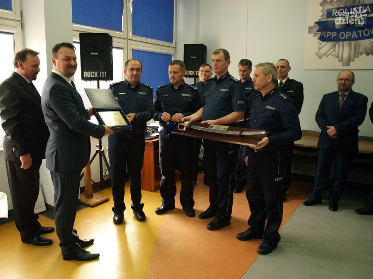 Odchodzących na emeryturę żegnali Komendant Powiatowy Policji insp. Ryszard Komański wraz z zastępcą mł. insp. Andrzejem Skowrońskim i kadrą kierowniczą oraz policjantami opatowskiej komendy. W uroczystości udział wzięli również zaproszeni goście: naczelnik Wydziału Ruchu Drogowego Komendy Wojewódzkiej Policji w Kielcach nadkom. Tomasz Janik, Komendant Powiatowy Państwowej Straży Pożarnej st. kpt. Sylwester Kochanowicz, kierownik Wydziału Zarządzania Kryzysowego Starostwa Powiatowego w Opatowie Artur Kargulewicz oraz komendant Straży Miejskiej w Opatowie Jerzy Potocki.