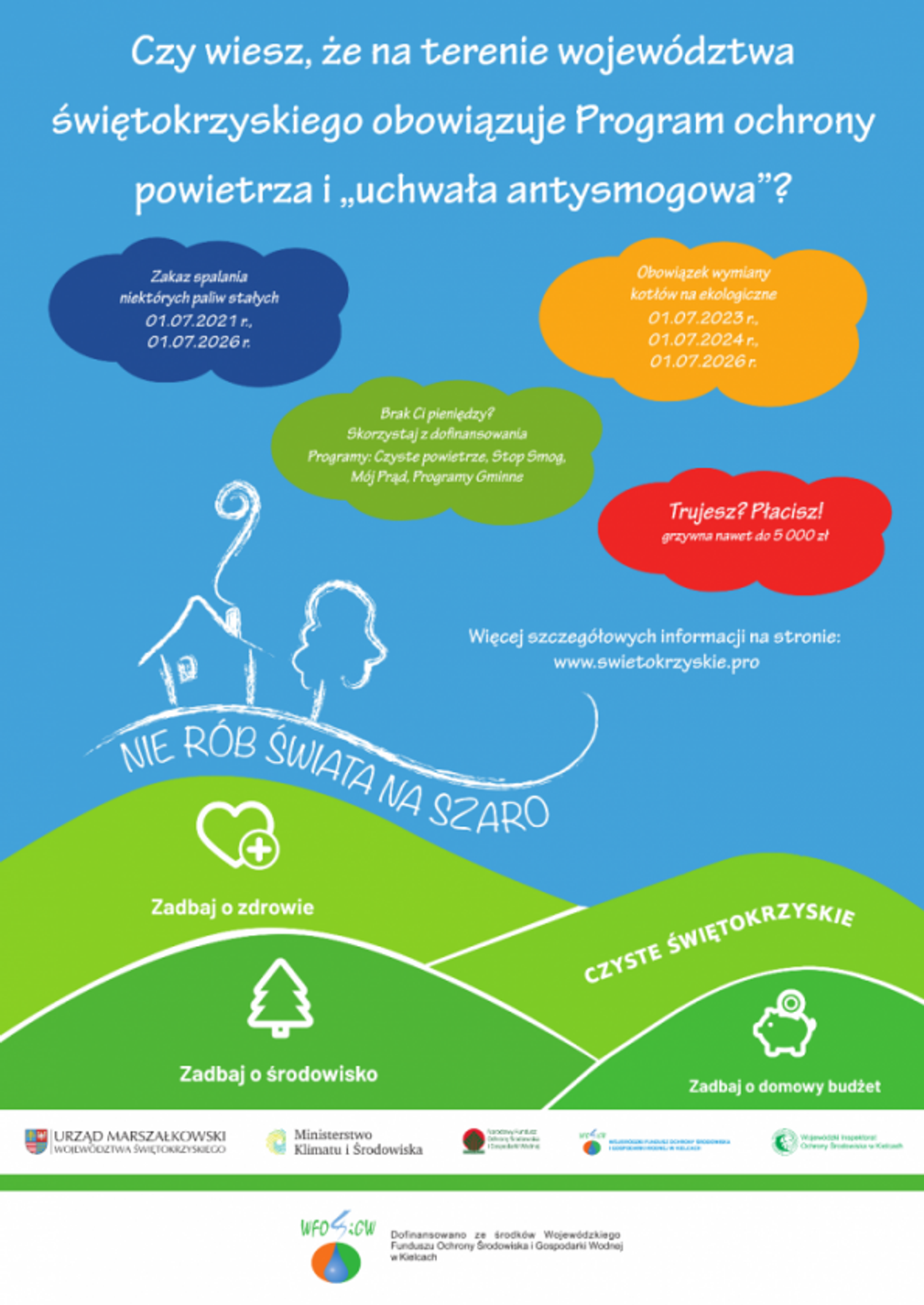 Mając na celu eliminację źródeł pogarszających jakość powietrza w naszym regionie, Sejmik Województwa Świętokrzyskiego w dniu 29 czerwca 2020 r. przyjął uchwałę Nr XXII/292/20 w sprawie wprowadzenia na obszarze województwa świętokrzyskiego ograniczeń i zakazów w zakresie eksploatacji instalacji, w których następuje spalanie paliw, tzw. „uchwałę antysmogową”. Zgodnie z tą uchwałą wszystkie nowe kotły na paliwa stałe instalowane po 1 lipca 2026 roku muszą spełniać wymagania tzw. ekoprojektu (dyrektywy unijnej, która określa normy emisji zanieczyszczeń dla urządzeń grzewczych).