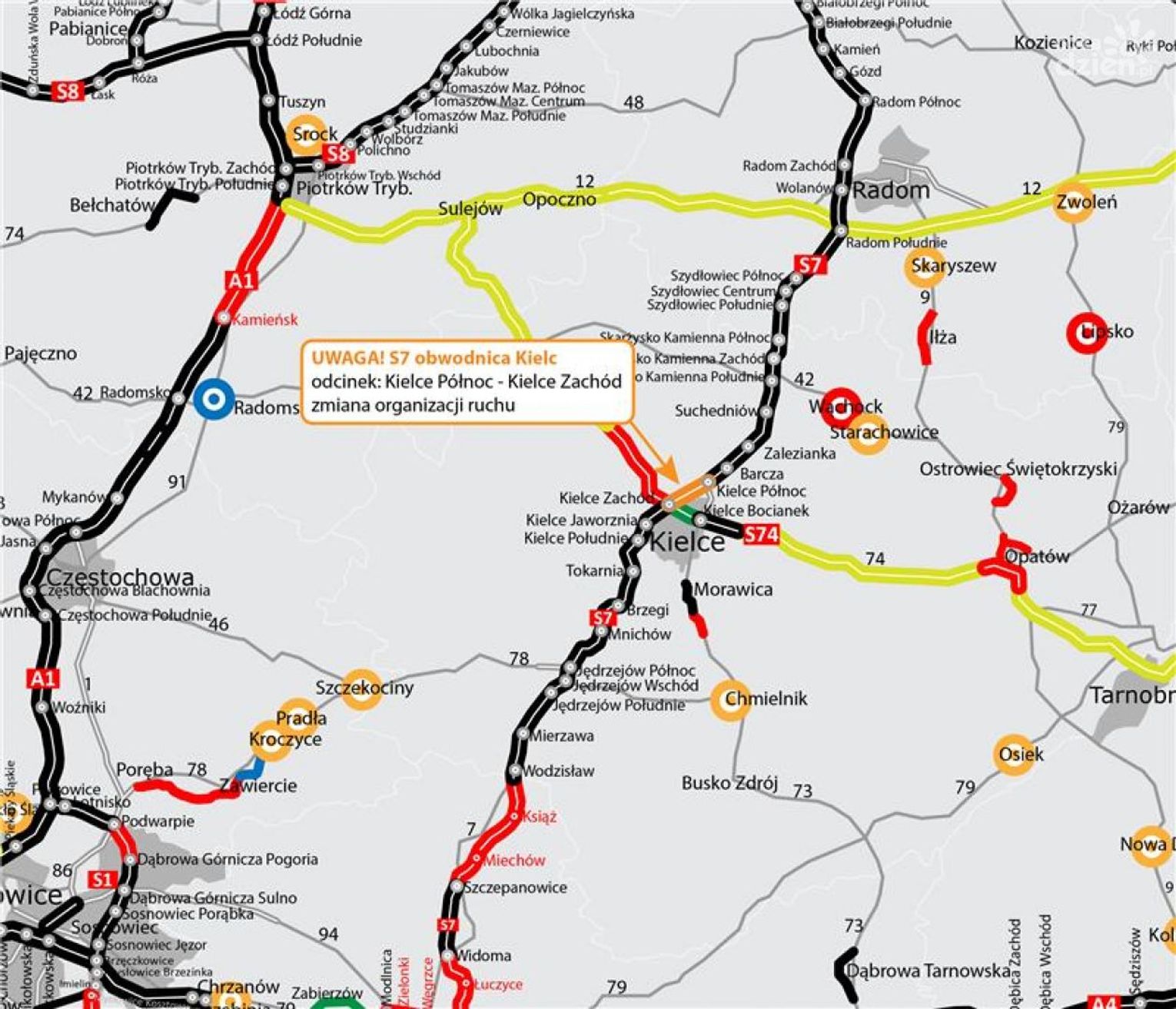 Ze względu na bezpieczeństwo użytkowników drogi ekspresowej S7, na odcinku między węzłem Kielce Północ a węzłem Kielce Zachód, bezpośrednio pod budowanym wiaduktem, wprowadzane będą tymczasowe zawężenia jezdni S7.