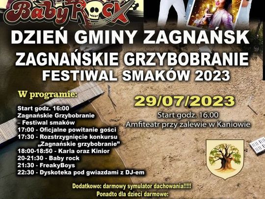 Wójt Gminy Zagnańsk Wojciech Ślefarski zaprasza 29 lipca na teren amfiteatru przy zalewie w Kaniowie na Dni Gminy Zagnańsk. Atrakcji będzie wiele, dla dorosłych, ale także dla najmłodszych. Start wydarzenia o godzinie 16, a przedsięwzięcie rozpocznie wielkie Zagnańskie Grzybobranie i Festiwal Smaków. Będzie także symulator dachowania, darmowe lody, wesołe miasteczko, czy malowanie twarzy dla najmłodszych, a zwieńczeniem Dni Gminy Zagnańsk będzie koncert zespołu FreakyBoys i dyskoteka pod gwiazdami!