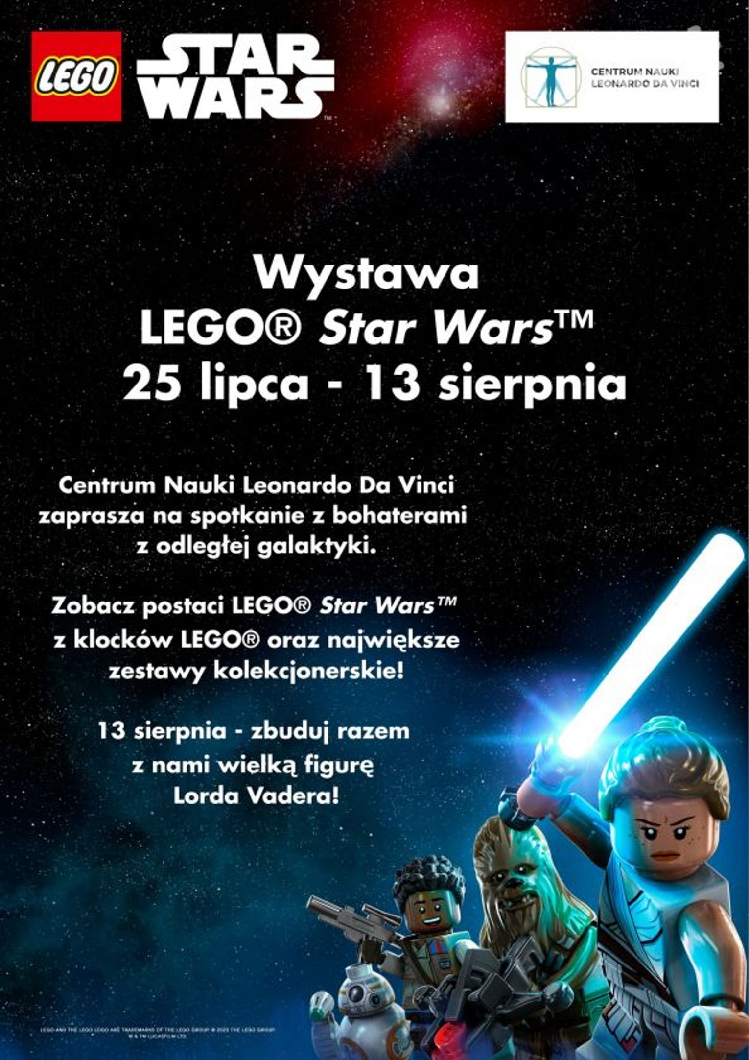 Gwiezdną ekspozycję oglądać można w różnych częściach Centrum Nauki do 13 sierpnia, kiedy odbyć się ma Gwiezdny Finał. Ci, którzy odwiedzą wtedy Centrum Nauki, będą mogli wziąć udział w budowaniu 2,5 metrowego modelu Dartha Vadera składającego się z 20 tysięcy klocków. Nad konstrukcją piecze sprawować będzie animator-budowniczy.