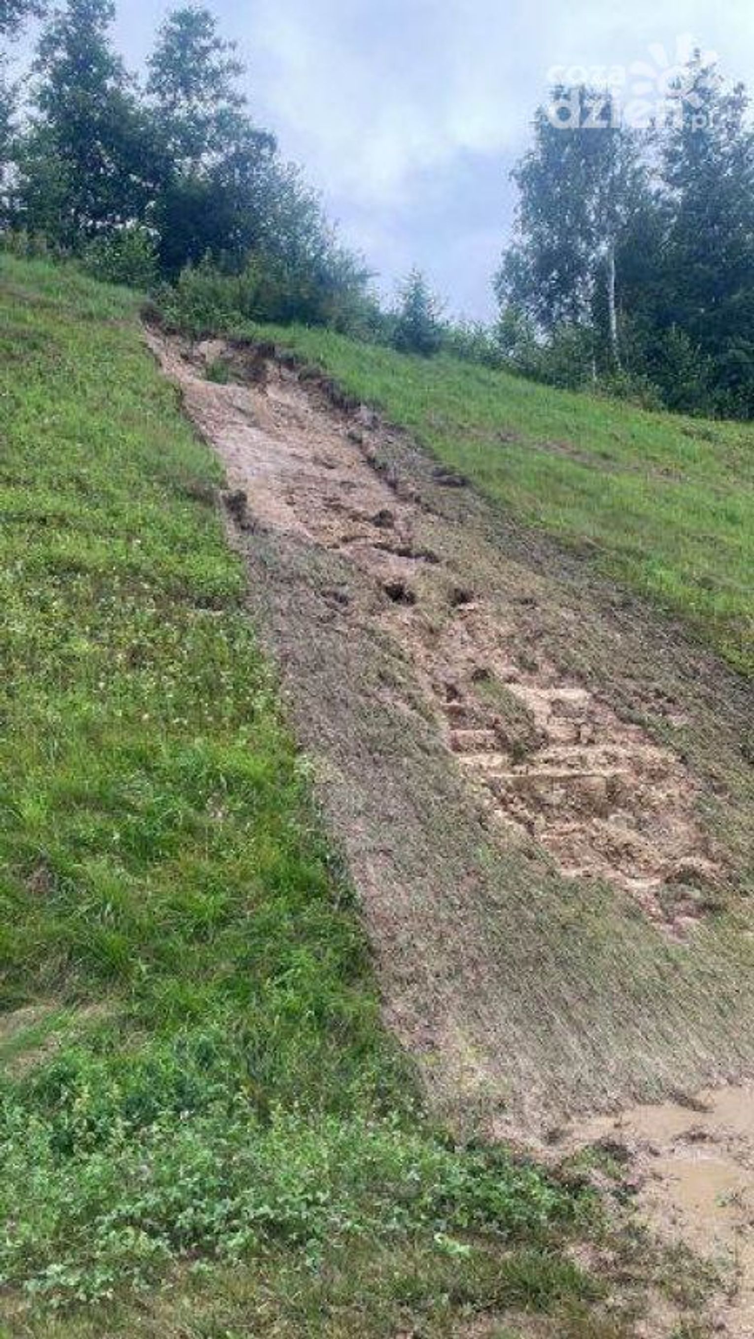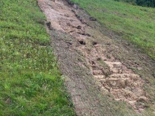 Podobna sytuacja jest w Ćmielowie na ul. Raciborskiego. Intensywne opady deszczu spowodowały podmycie terenu, mieszkańcy obawiają się osuwisk, które zagrażają budynkom mieszkalnym.