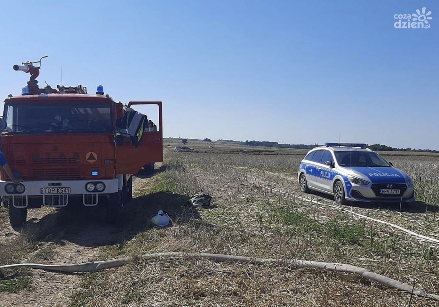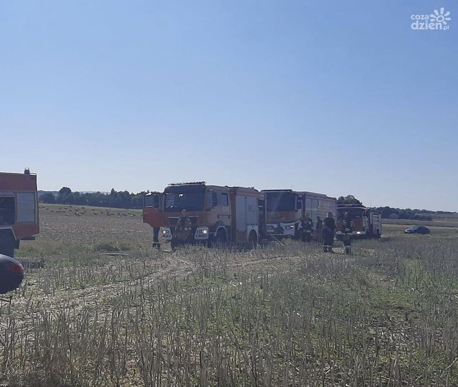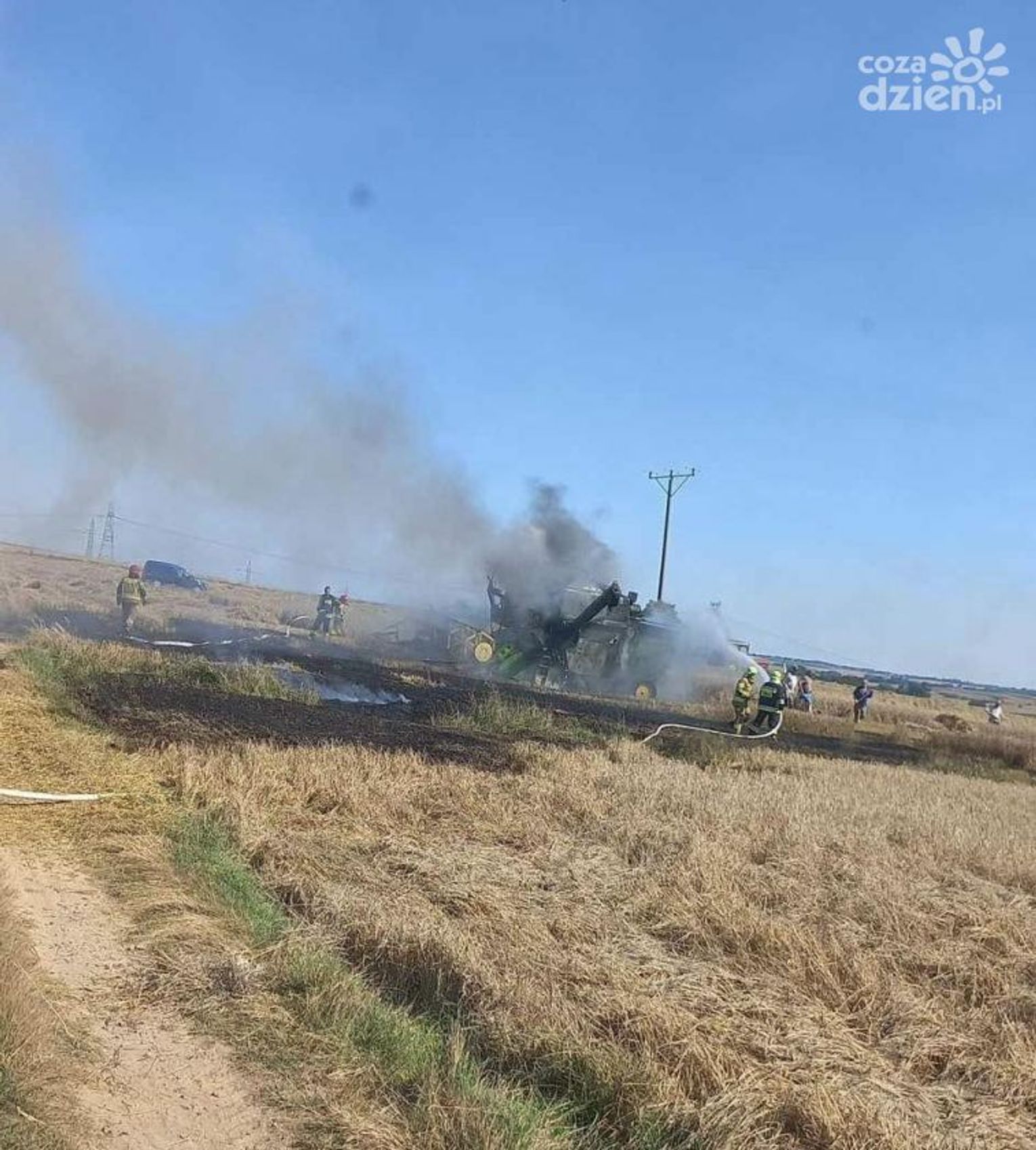 Zdarzenie miało miejsce na pograniczu dwóch powiatów, ostrowieckiego i opatowskiego. Ogień zajął nie tylko komorę maszyny ale przeniósł się także na ściernisko na powierzchnię około 2 arów. Przed przybyciem strażaków kombajnista sam ugasił pożar komory silnika. Jednostki, które zjawiły się na miejscu zdarzenia zabezpieczyły teren i dogasiły ogień maszyny oraz ugasiły palące się ściernisko. Kombajn został sprawdzony za pomocą kamery termowizyjnej, czy nie ma w nim jeszcze zarzewi ognia.