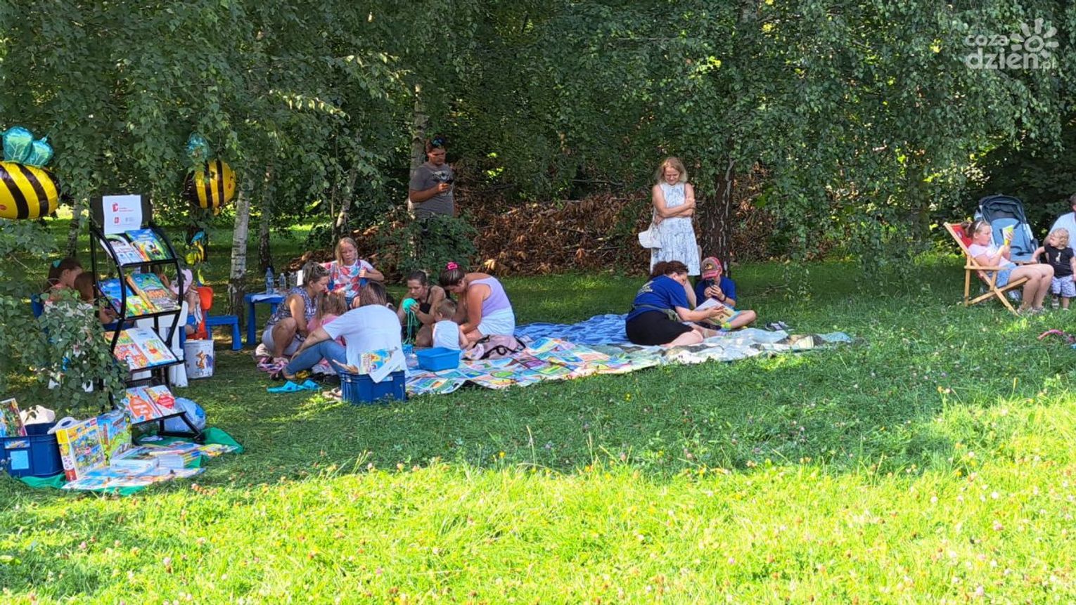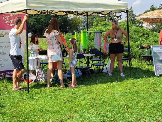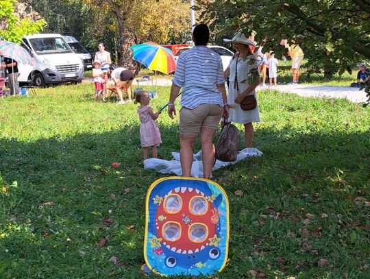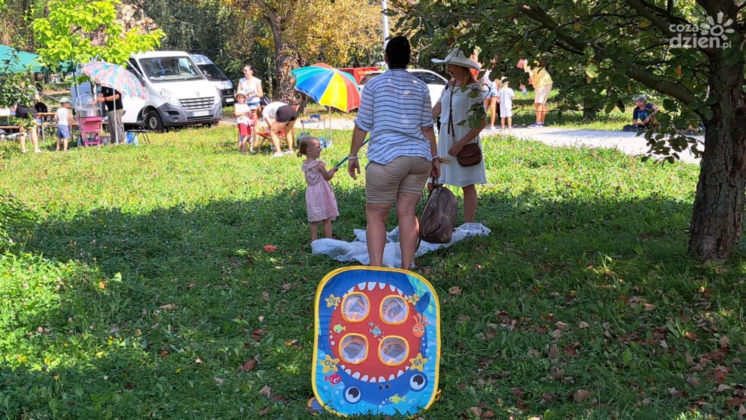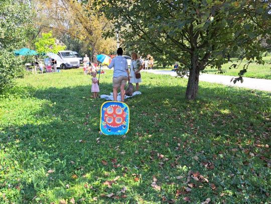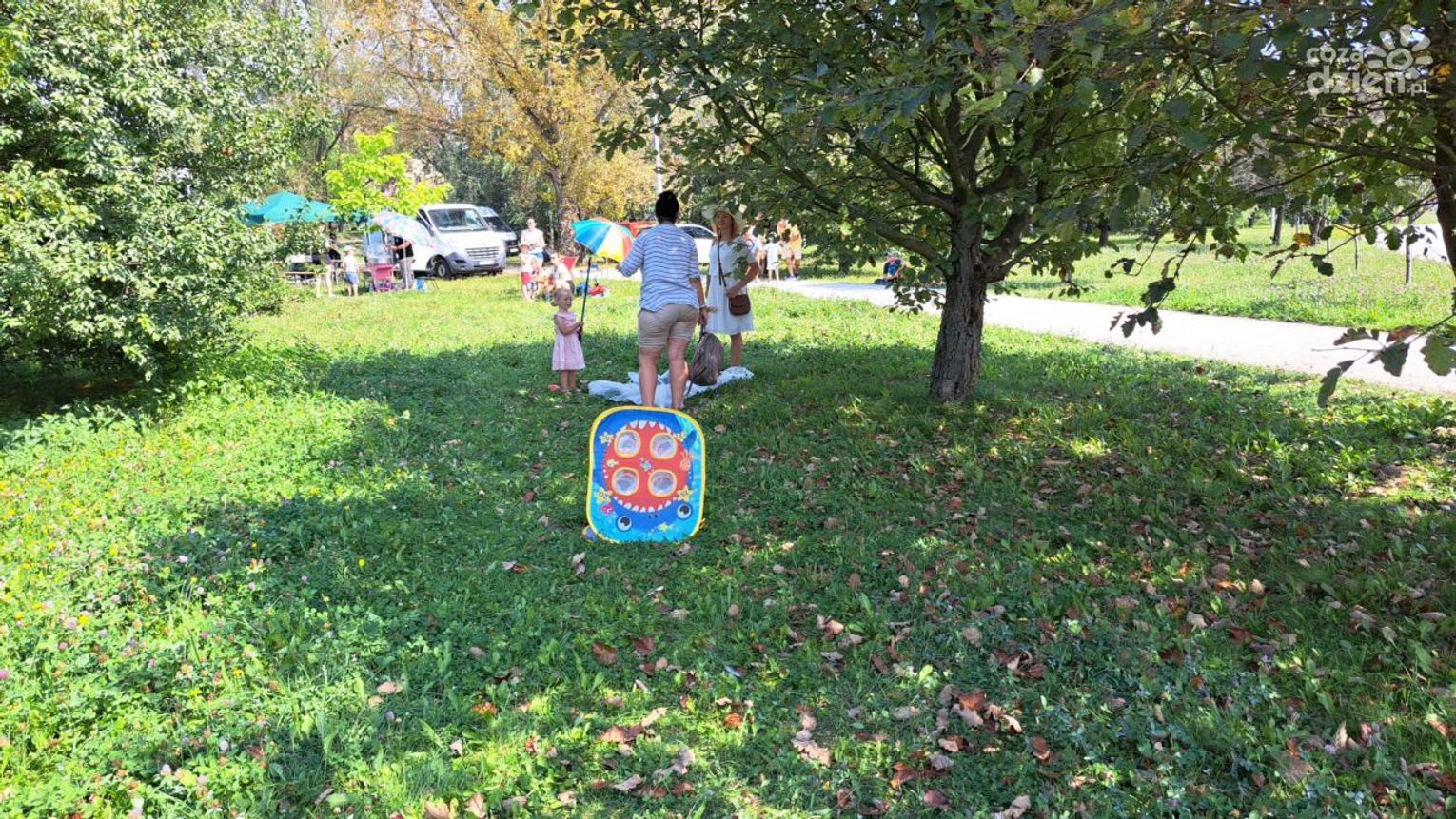 Skakanka, hula hop czy gra w bule, w takie gry i zabawy bawią się uczestnicy pikniku rodzinnego zorganizowanego przez Fundację Aktywne Mamy w ostrowieckim parku miejskim.