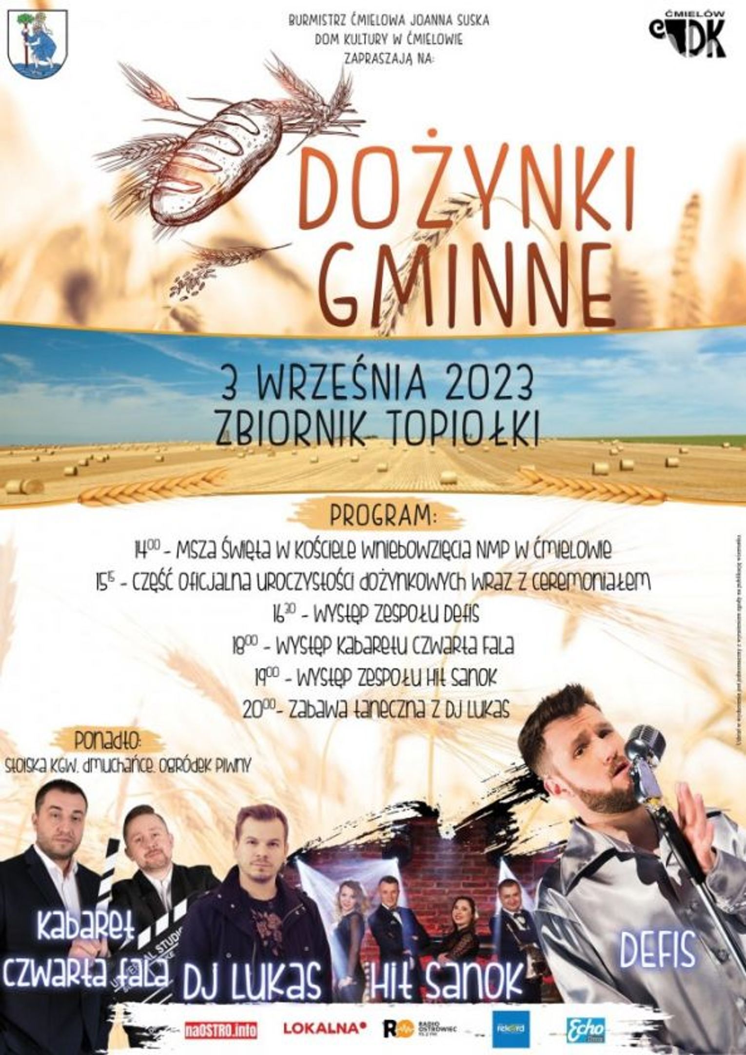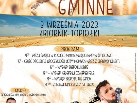 Za to w ćmielowskie dożynki rozpoczną się o 14 mszą świętą w tamtejszym kościele. A od 15.15 na terenach przy zbiorniku wodnym Topiołki cześć oficjalna uroczystości dożynkowych i występy między innymi zespołu Defis, kabaretu Czwarta fala. Wieczorem występ zespołu Hit Sanok i od 20 zabawa taneczna z DJ Lukas. Nie zabraknie też stoisk z KGW, dmuchańców i stoisk gastronomicznych.