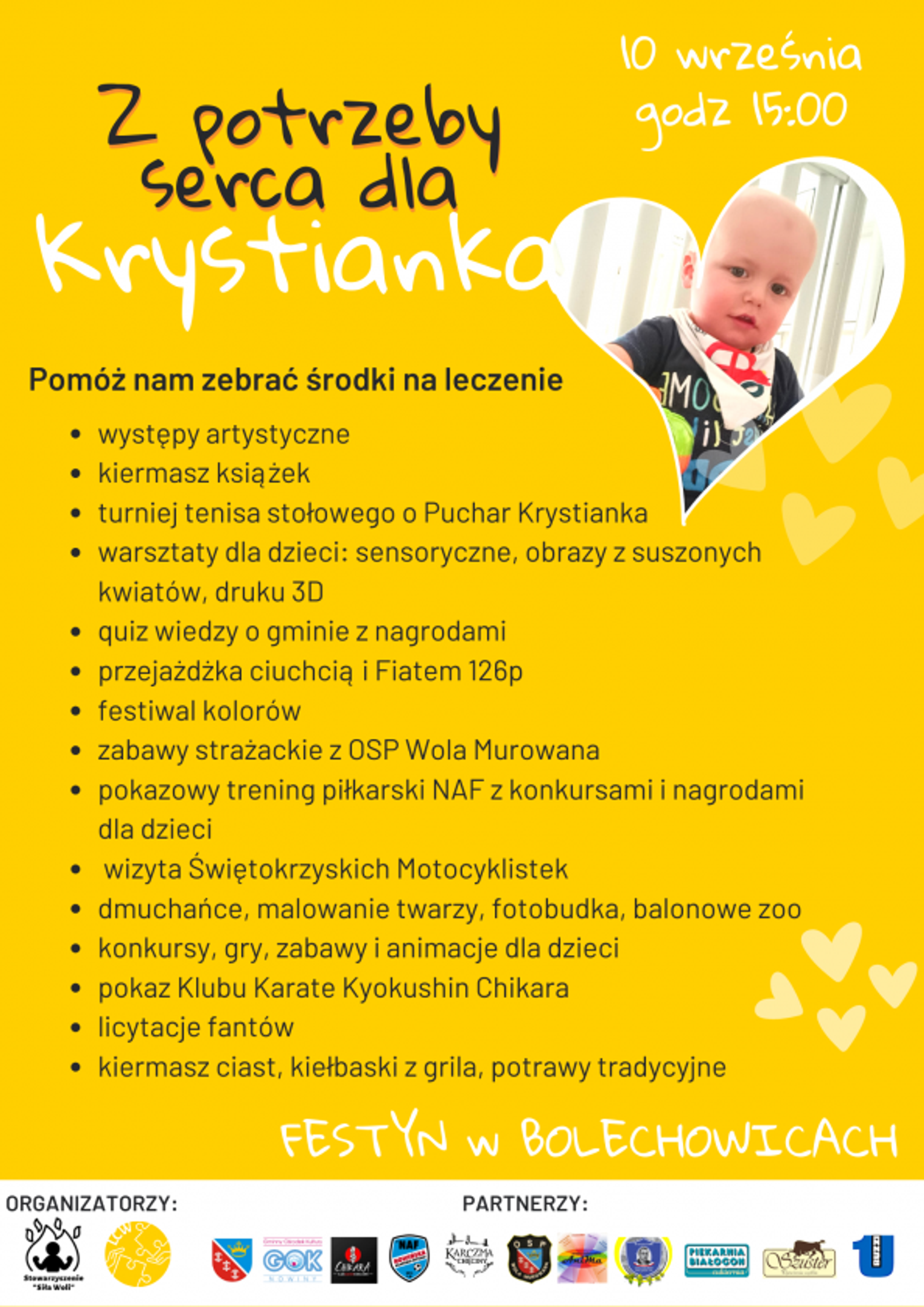 By pomóc rodzinie nasze Stowarzyszenie organizuje także festyn charytatywny z atrakcjami dla całych rodzin w dniu 10.09.2023 roku na terenie Zespołu Placówek Oświatowych w Bolechowicach. Będzie tam prowadzona zbiórka do puszek i licytacje fantów na rzecz małego Krystianka. W organizację wydarzenia solidarnie włączają się mieszkańcy oferując ze swej strony wolontaryjne pomoc w organizacji i przebiegu festynu np. poprzez upieczenie ciast, kwestowanie z puszką czy poprowadzenie animacji dla dzieci. Lokalne firmy również solidaryzują się z trudną sytuacją rodziny oferując wpłatę na zbiórkę lub wsparcie finansowe organizacji wydarzenia.