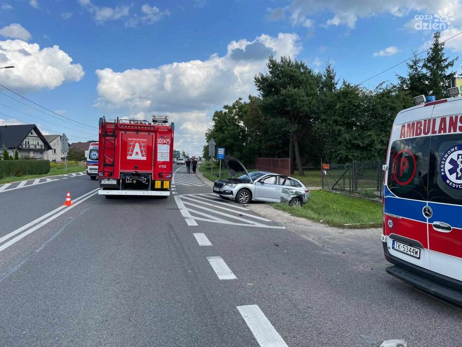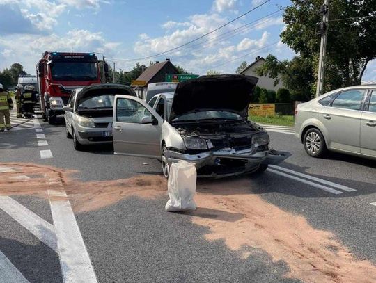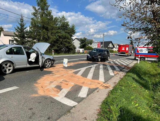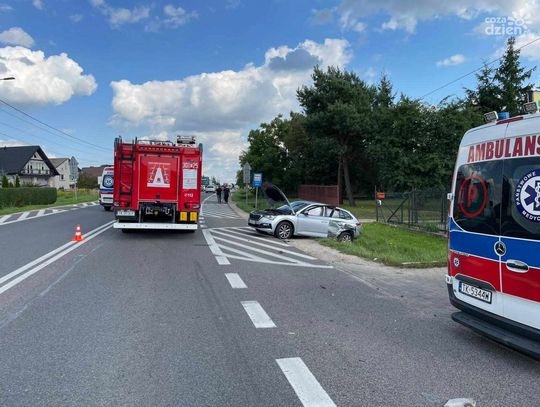 Po zderzeniu jedno auto wypadło z drogi do przydrożnego rowu. Na miejscu pracuje 2 zastępy straży, policja i ZRM.
