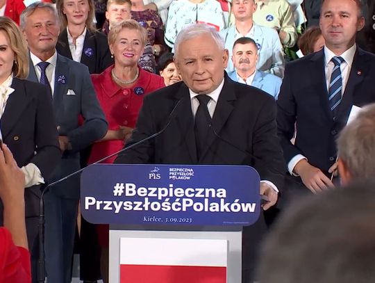 Prezes PiS Jarosław Kaczyński tłumaczył powody swojego startu z Kielc - Odpowiedź jest prosta: Polska jest jedna. Mam nadzieję, że nasz cel ujęty w krótkim haśle - bezpieczna przyszłość Polaków - że ten cel zostanie zrealizowany. Ale jest jeden warunek: nasze zwycięstwo w wyborach" - mówił prezes PiS.