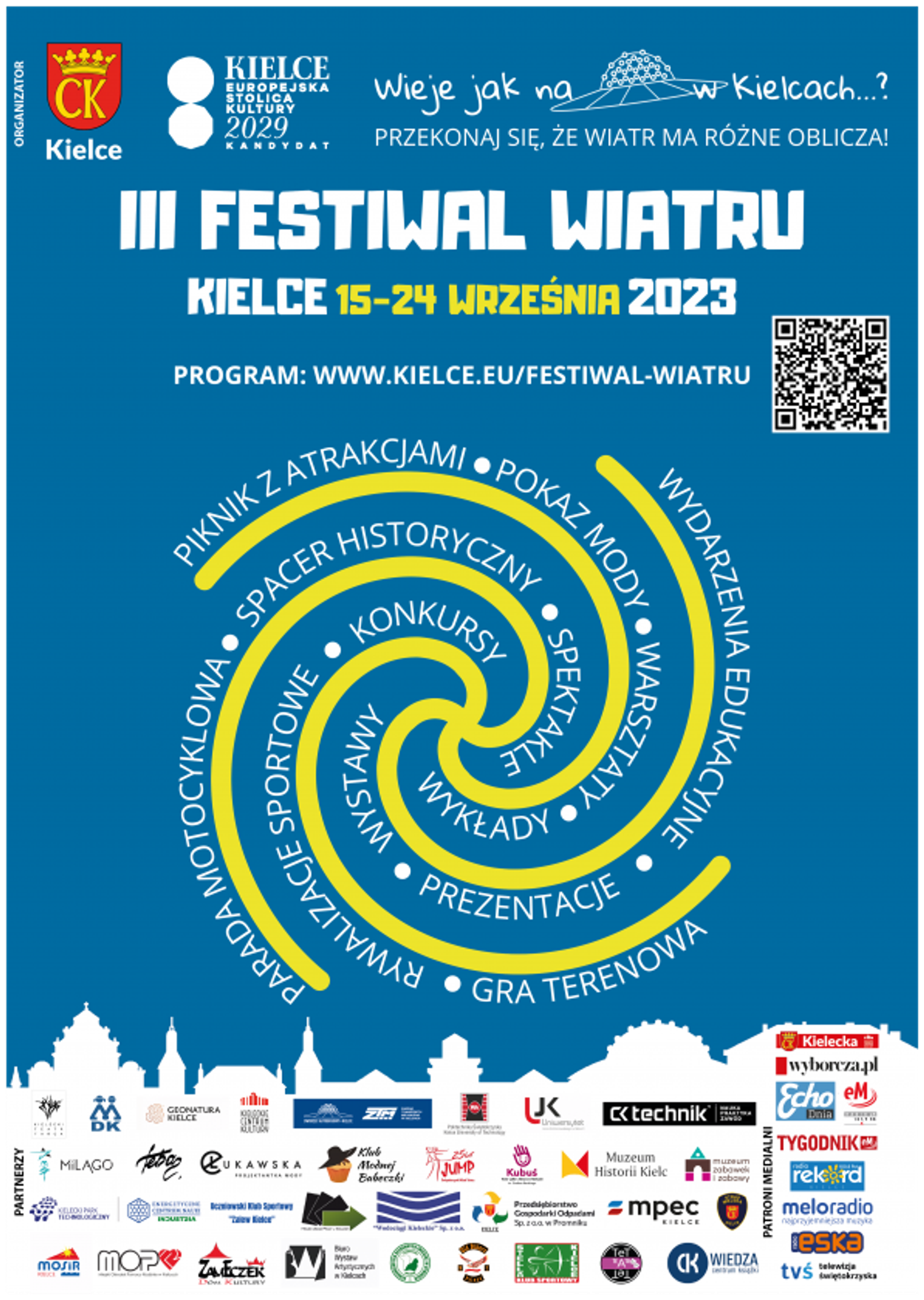 III Festiwal Wiatru zainauguruje premiera widowiska „Syrenka Ariel” Kieleckiego Teatru Tańca (15. 09). Dzień później - gratka dla miłośników mody, bowiem podczas „Zwiewnego Wieczoru ze Sztuką i Modą” na Dworcu Autobusowym modelki zaprezentują aż 6 różnych kolekcji (16.09). Zapraszamy też do udziału w konkursach z nagrodami: plastycznym „Ptaki - wietrzne cudaki”, II Konkursie Fotograficznym pn. „Wiecz(trz)ne Kielce” czy pt. „Jolka o zawodach wietrznych”. Zachęcamy do wspólnej zabawy na Pikniku Rodzinnym „Wiatr w żagle”, któremu towarzyszyć będą Regaty Żeglarskie o Puchar Festiwalu Wiatru na Zalewie Kieleckim (23.09). Dla uczestników przygotowujemy mnóstwo atrakcji. Będzie świetna zabawa, m.in. rywalizacje sportowe, konkursy, warsztaty, bezpłatne „dmuchańce” czy degustacje. Na fanów motoryzacji czeka Parada Motocyklowa (23.09), dla tych którzy chcieliby sprawdzić, jak celne mają oko, odbędą się Zawody Łucznicze o Puchar Prezydenta Kielc (21.09).