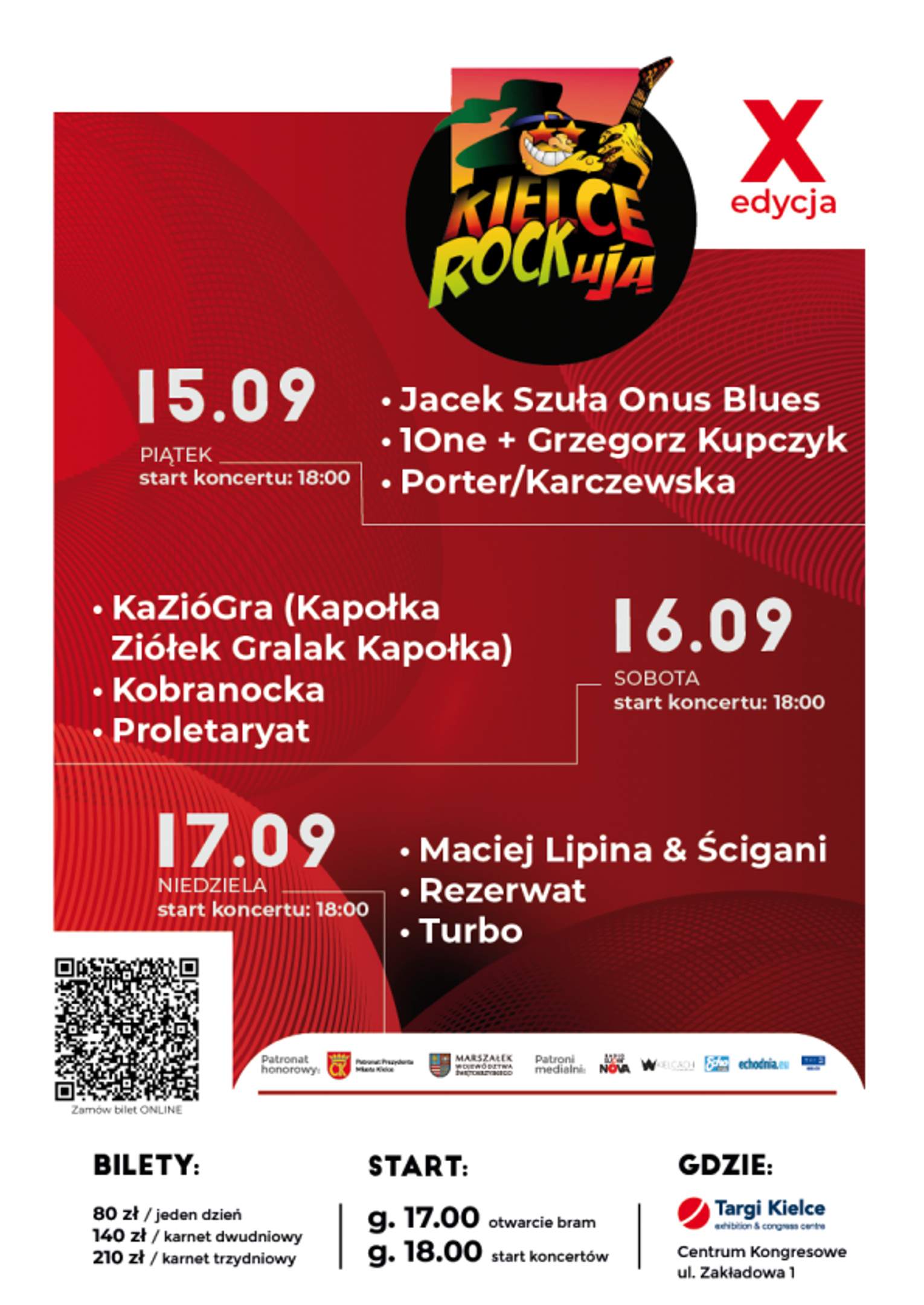 Mocnych brzmień i wspaniałych wykonów kultowych utworów dostarczą uczestnikom trzeciego dnia kieleckiego festiwalu, w niedzielę 17 września zespół Turbo – legenda polskiego heavy metalu, grupa nowofalowa – Rezerwat, których największy przebój „Zaopiekuj się mną” był wykonywany przez wielu artystów polskiej sceny muzycznej, a także Maciej Lipina - utalentowany wokalista bluesowy i lider grupy Ścigani. X edycja festiwalu Kielce ROCKują to nie tylko wyjątkowe koncerty, ale również wspaniała atmosfera i spotkania z artystami.