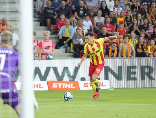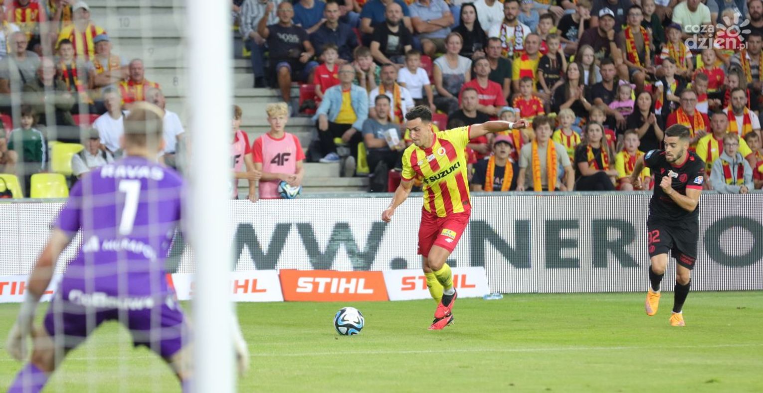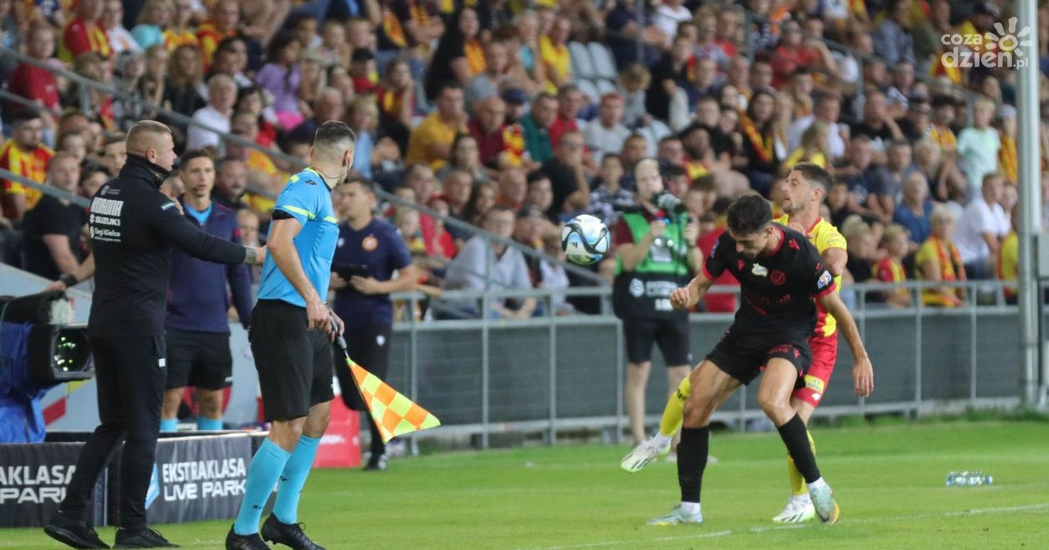 Pierwsza połowa zaczęła się wyśmienicie, bo już w drugiej minucie po składnej akcji i ładnym dośrodkowaniu Zatora, piłke do siatki wpakował Mateusz Czyżycki. Po kolejnych dobrych akcjach gospodarzy (najlepszą okazję miał Shikavka, który przegrał pojedynek sam na sam z Ravasem) wydawało się, że kielczanie odniosą drugie łatwe zwycięstwo. Niestety... niestety jak to już bywa, jeden nieodpowiedzialny błąd i wypadasz z gry. W tym przypadku było podobnie. Całą pierwszą połowę Zator grał dobrze i nagle w 41. minucie popełnił arcyważny błąd. Obrońca Korony faulował w polu karnym Shehu (choć co do tego są duże wątpliwości), a "jedenastkę" na bramkę zamienił, były gracz Korony w latach 2015 - 2016, Bartłomiej Pawłowski. Pierwsza połowa zakończyła się wynikiem 1:1.