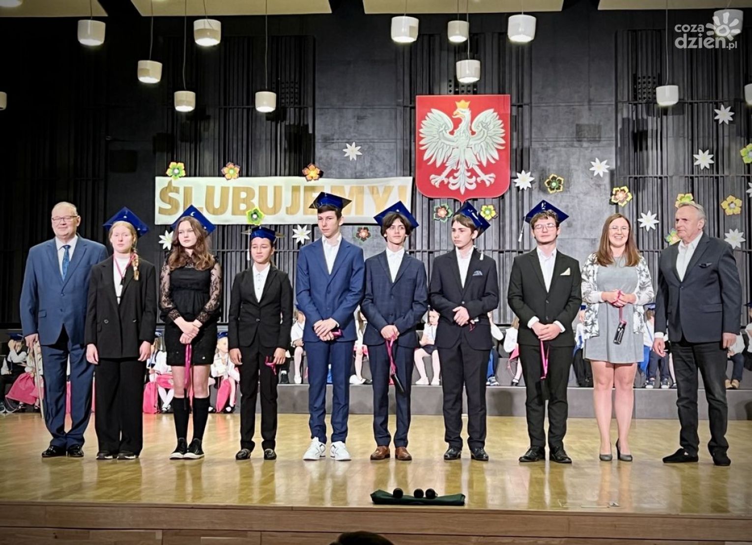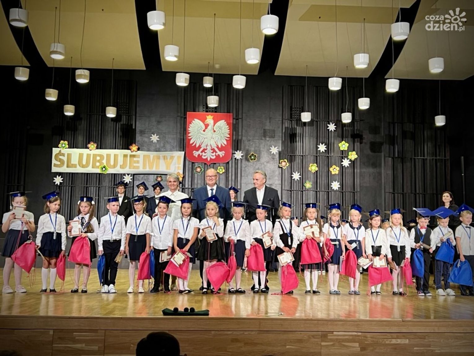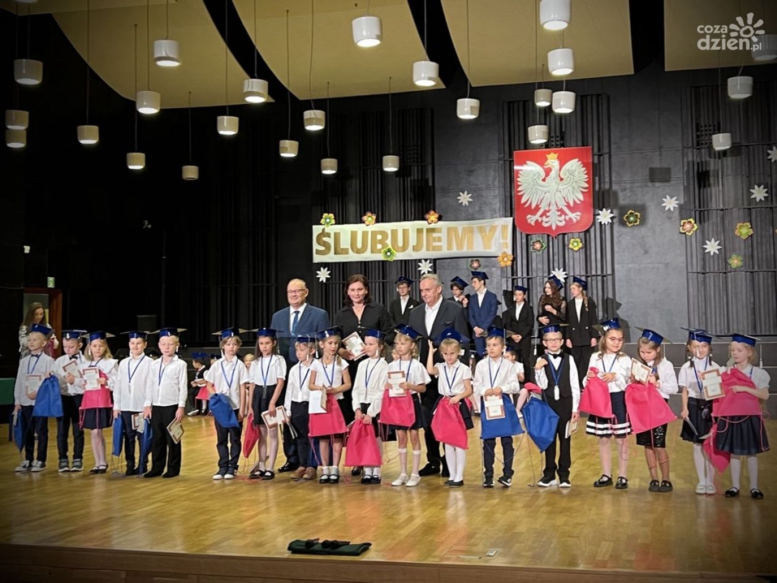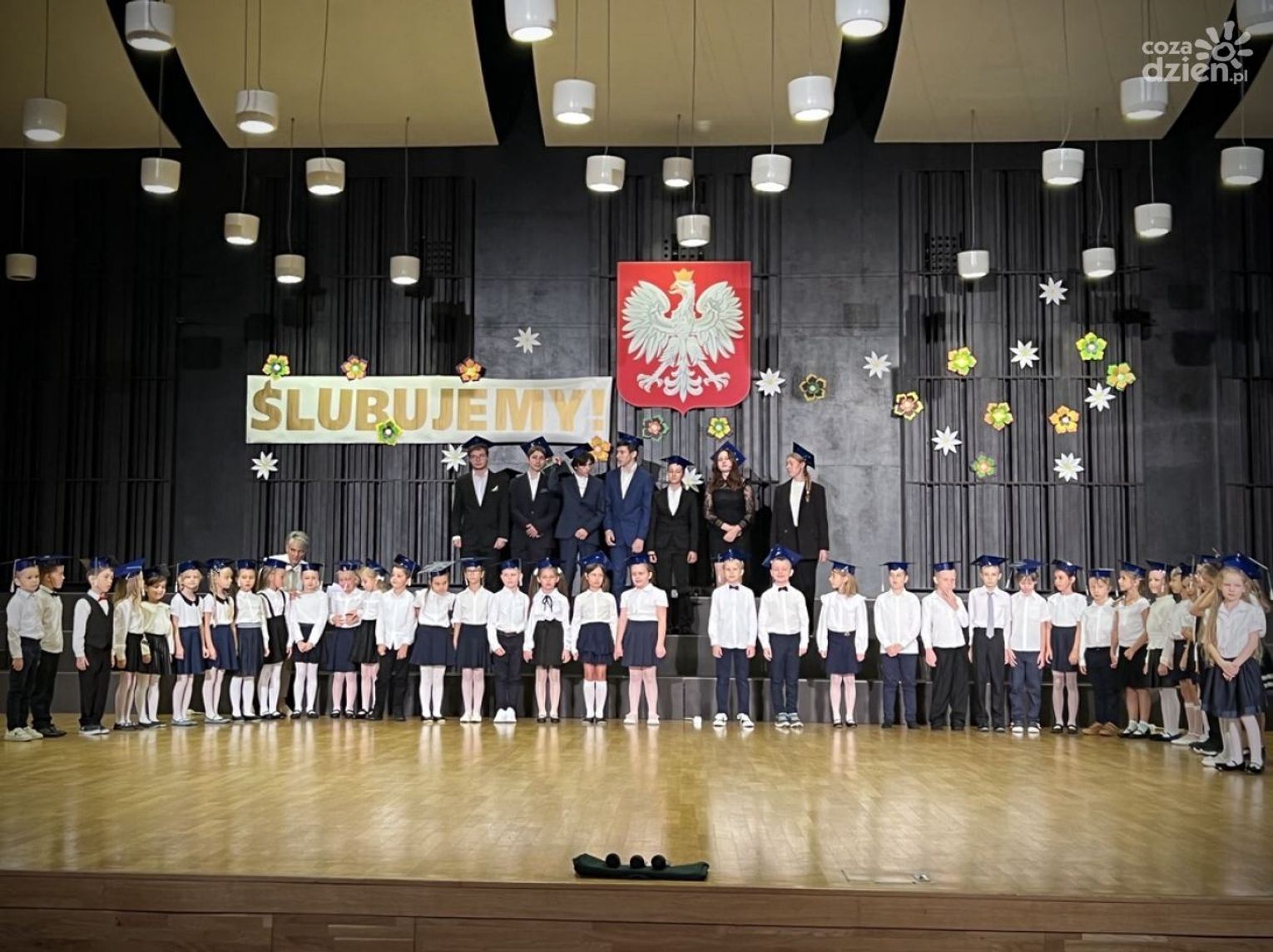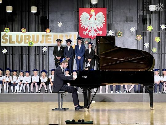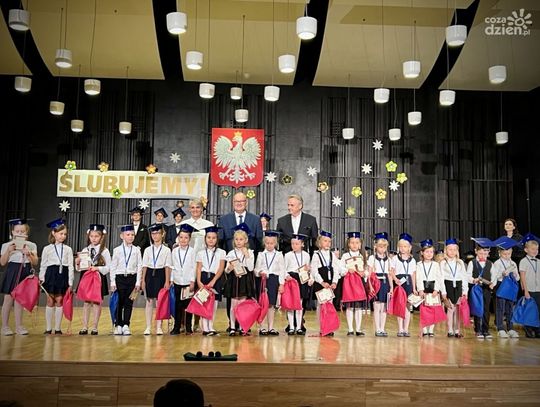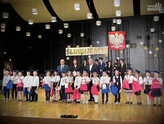 Pierwszaki zatańczyły wspólnie poloneza. Jak na żaków przystało, na głowach mieli specjalne czapki uczniowskie z chwostem. Ci ze szkoły I stopnia zaśpiewali "Do pierwszaków wpadły nutki", zaś rozpoczynający II stopień edukacji umilili wydarzenie grą na instrumentach.