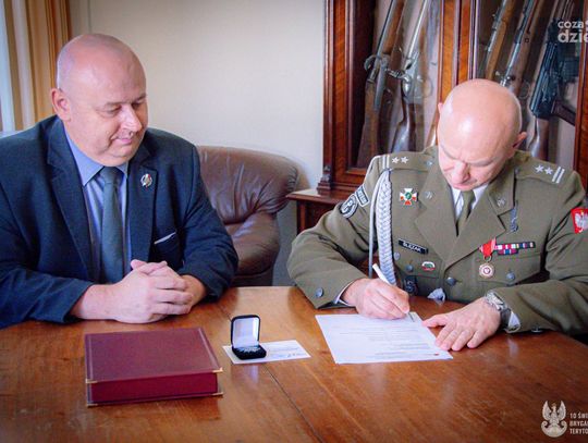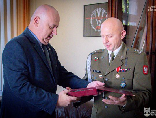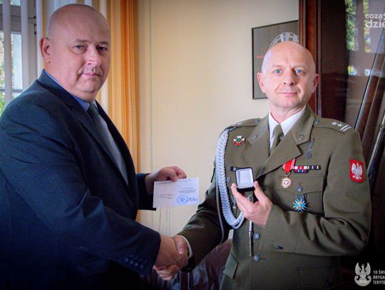 Uroczyste przekazanie odbyło się 3 października 2023r. w MWP. Na ręce Pana dyrektora Pawła Żurkowskiego odznakę wraz z pamiątkowym grawertonem przekazał ppłk Ireneusz Ślęzak z-ca. dowódcy 10 ŚBOT. Od dzisiaj każdy kto odwiedzi warszawskie Muzeum będzie mógł zobaczyć wśród kolekcji odznak poszczególnych brygad Wojsk Obrony Terytorialnej, także tą ze Świętokrzyskiej brygady WOT. Jestem naprawdę dumny z tego, że naszą odznakę możemy prezentować wszystkimrodakom odwiedzającym Muzeum Wojska Polskiego. Znalezienie się w gronie tak znamienitych poprzedników jest wielkim honorem i zobowiązaniem dla obecnych i przyszłych żołnierzy – podkreślił ppłk Ireneusz Ślęzak z-ca dowódcy 10 ŚBOT. Odznaka pamiątkowa 10 Świętokrzyskiej Brygady Obrony Terytorialnej im. mjr. Eugeniusza Gedymina Kaszyńskiego, ps. "Nurt" została ustanowiona na mocy decyzji nr 23/MON Ministra Obrony Narodowej z dnia 17 lutego 2020r. Odznaka o wymiarach 40x40 mm ma kształt krzyża maltańskiego barwy błękitnej, nawiązującej do barwy z herbu województwa świętokrzyskiego, z obrysem w kolorze srebrnym. Pośrodku krzyża, naniesionego na dwa stalowe miecze, znajduje się stylizowany jeleń św. Emeryka z krzyżem między rogami, wpisany w symbol Polski Walczącej (w kolorze złotym), który jest znakiem Środowiska Świętokrzyskich Zgrupowań Partyzanckich Armii Krajowej "Ponury" - "Nurt". Jeleń symbolizuje klasztor benedyktynów na Świętym Krzyżu, którego powstanie wiąże się z legendą o św. Emeryku, który polując na jelenie z księciem Mieszkiem, ofiarował klasztorowi fragment Świętego Krzyża. Od przechowywanej w klasztorze relikwii Świętego Krzyża pochodzi nazwa województwa świętokrzyskiego. Wokół krzyża biegnie krajka świętokrzyska - zapaska w czerwono-czarne prążki z przełomu XIX i XX wieku. Jej częściowe ukrycie symbolizuje Państwo Podziemne w czasie okupacji, a widoczne części - dwa okresy niepodległości przed i po II wojnie światowej. W dolnej części pasa znajduje się złota liczba "10" - numer porządkowy 10ŚBOT.