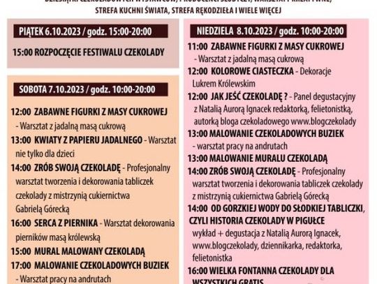 Udział jest bezpłatny. W sobotę i niedzielę wydarzenie będzie trwało między 10 a 20. Na wielki finał, który odbędzie się w niedzielę o godzinie 16.00 organizatorzy zaplanowali uruchomienie czekoladowej fontanny.