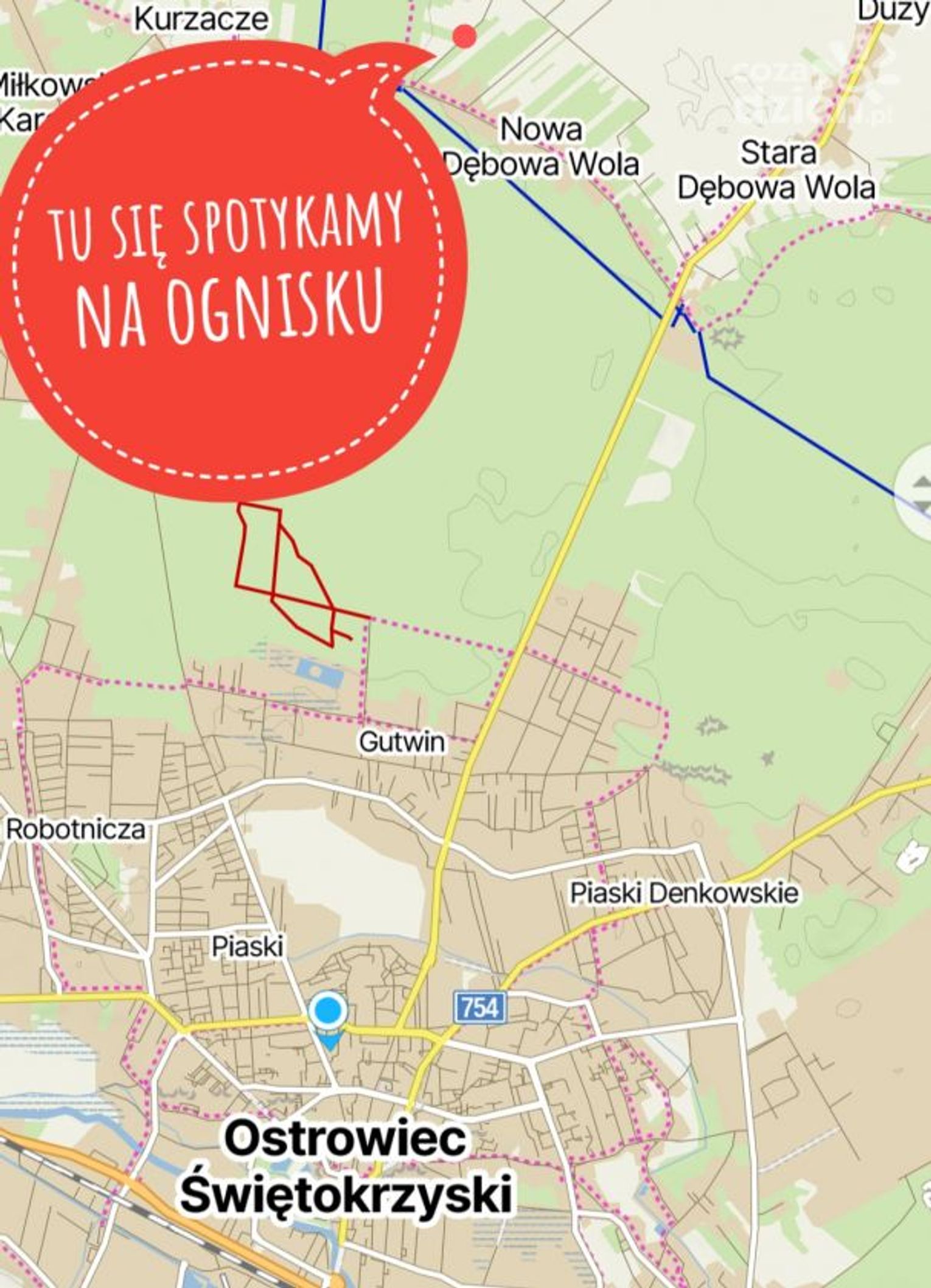 Do Nowej Dębowej Woli można także dotrzeć drogą leśną przez Gutwin lub ul. Iłżecką w kierunku Kolonii Miłkowskiej i Kurzaczy. Miejsce spotkania i ogniska pokazuje załączona mapa.