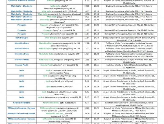 Bezpłatne połączenia będą m.in. z Udzicowa, Biechowa, Bukowia, Małego Jodła, Chocimowa, Prawęcina, Dołów Biskupich, Nietuliska, Janika, Kolonii Inwalidzkiej, Miłkowskiej Karczmy, Kurzaczy, Boksycki czy Rudki. Z tych miejscowości wykonywanej będą po dwa kursy, jeden przedpołudniowy i drugi popołudniowy. Autobusy będą wykonywały też kursy powrotne.