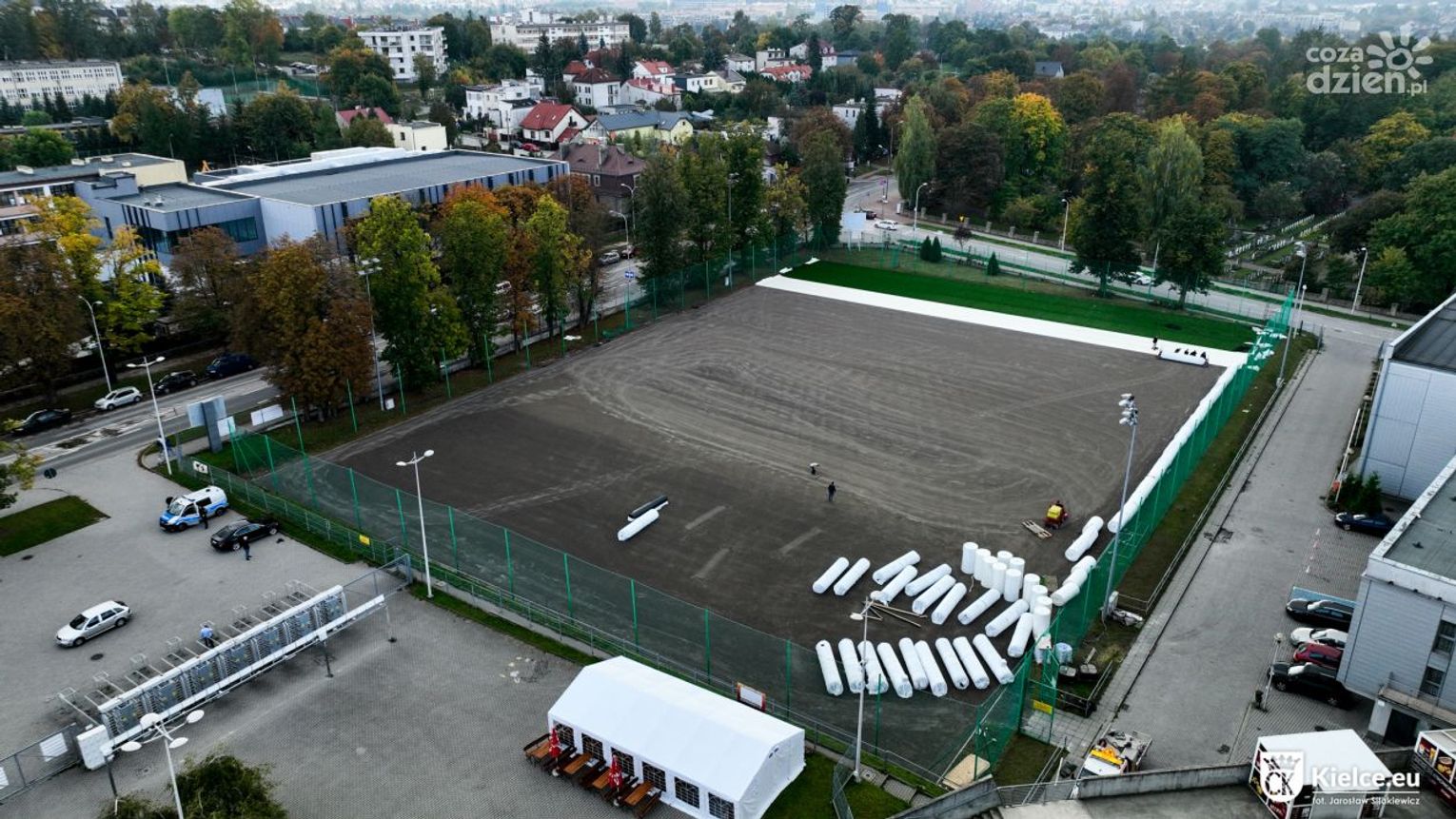 Pierwszy etap inwestycji rozpoczął się 12 września. Zdemontowano wówczas dotychczasową murawę. Obecnie, po odpowiednim wyprofilowaniu podłoża, trwa układanie nowej nawierzchni.