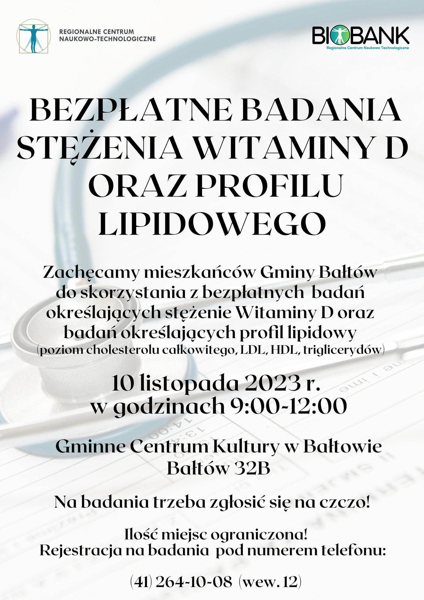 W ramach drugiego oferowanego badania chętni mieszkańcy bezpłatnie będą mogli określić stężenie witaminy D oraz profilu lipidowego. Badanie to przeprowadzone zostanie 10 listopada w godzinach od 9.00 do 12.00 w Gminnym Centrum Kultury w Bałtowie.