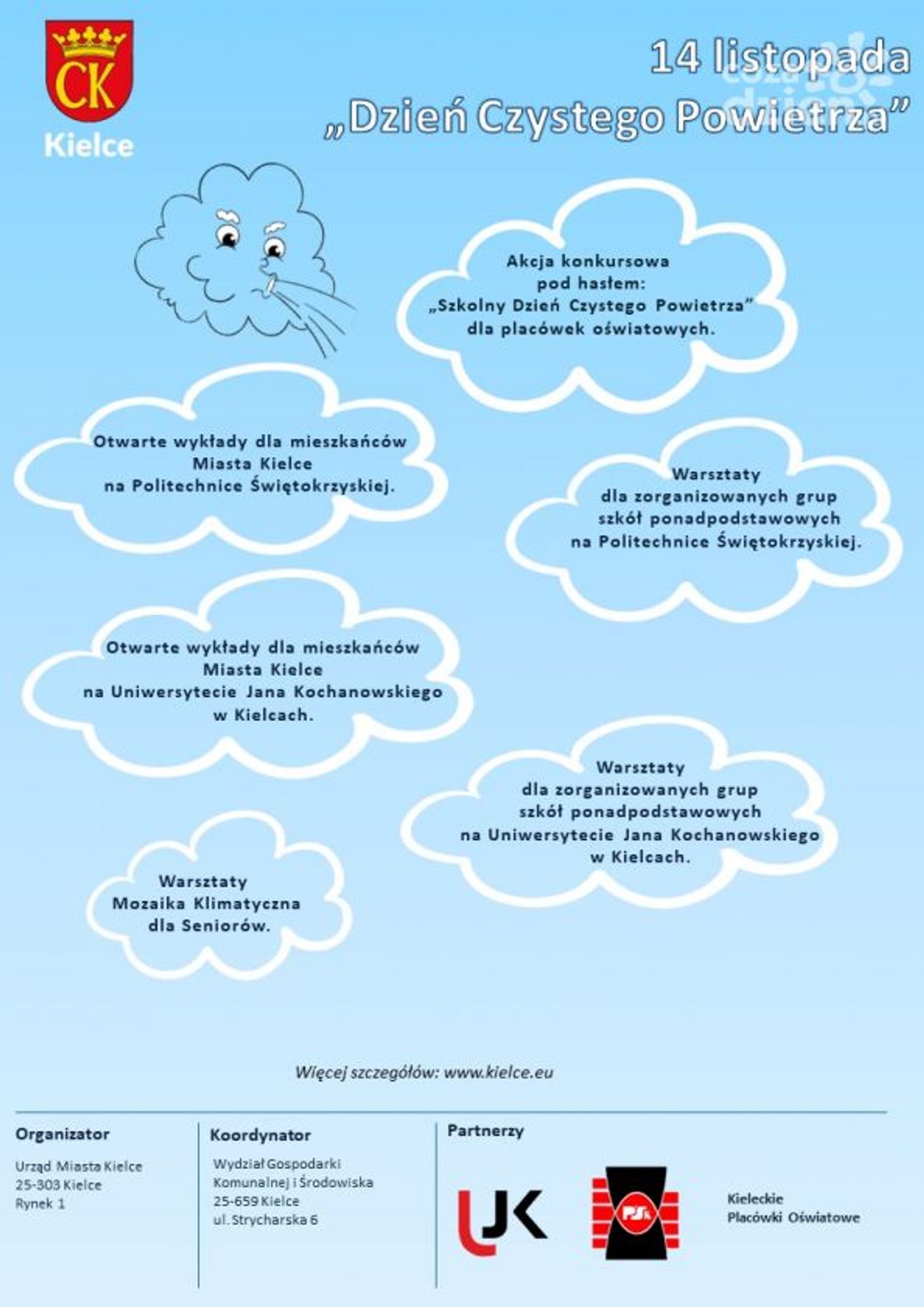 Uczniów kieleckich szkół zapraszamy do akcji konkursowej pn.: „Szkolny Dzień Czystego Powietrza” polegającej na zorganizowaniu na terenie placówki oświatowej akcji pokazującej wpływ mieszkańców miasta na zanieczyszczenia powietrza.