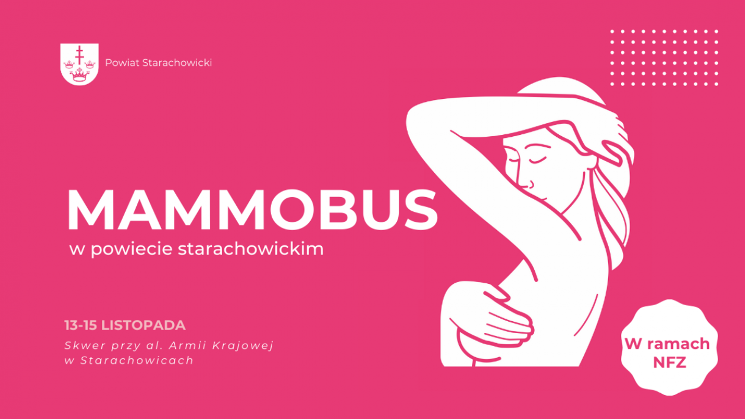 Mieszkanki powiatu starachowickiego będą mogły skorzystać z bezpłatnych badań mammograficznych w ramach Narodowego Funduszu Zdrowia. Będzie to możliwe w mammobusie, który od 13 do 15 listopada - będzie stacjonował na skwerze po dawnym placu handlowym przy al. Armii Krajowej w Starachowicach.