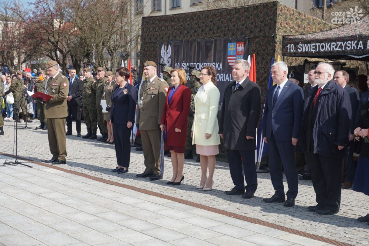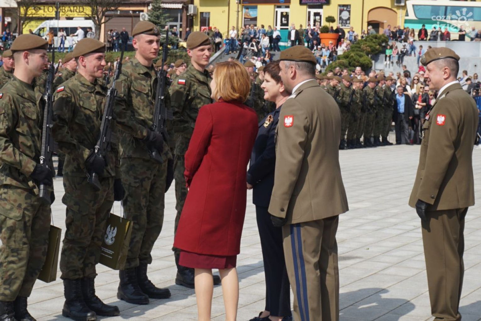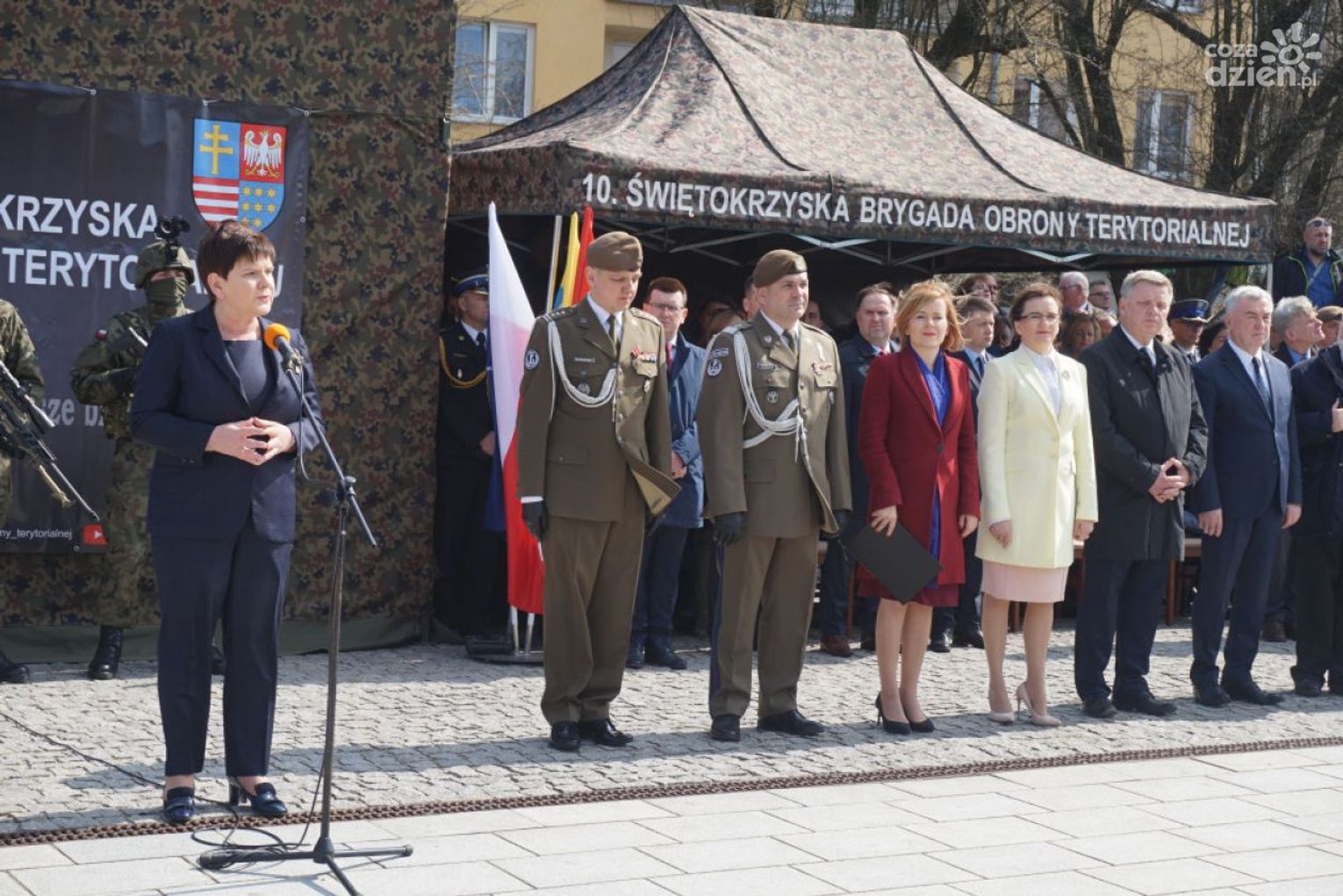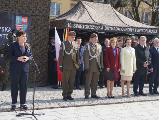 – Dołączyliście do szeregów polskiego wojska, jednocześnie nawiązując do pięknej tradycji poprzednich pokoleń, tradycji waszych dziadów, waszych ojców, tradycji tej ziemi – zwróciła się do żołnierzy B. Szydło. – Dołączyliście do elitarnej grupy, na której ciąży odpowiedzialność za Polskę, za jej bezpieczeństwo. Stajecie dzisiaj w równym szeregu z tymi, którzy gotowi są ponieść najwyższą cenę, broniąc ojczyzny, naszego domu. Ale wojska obrony terytorialnej to jest także służba lokalnej wspólnocie, waszym sąsiadom, rodzinom, bliskim, tej ziemi.