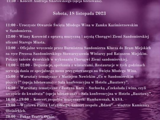 Będą też wydarzenie towarzyszące, czyli koncerty. Już w piątkowy wieczór, 17 listopada, na nadwiślańskim Bulwarze wystąpi Andrzej Sikorowski z koncertem właśnie na Święto Młodego Wina. Kolejne koncerty zaplanowano w podcieniach Kamiennicy Oleśnickich już w sobotni wieczór, 19 listopada.