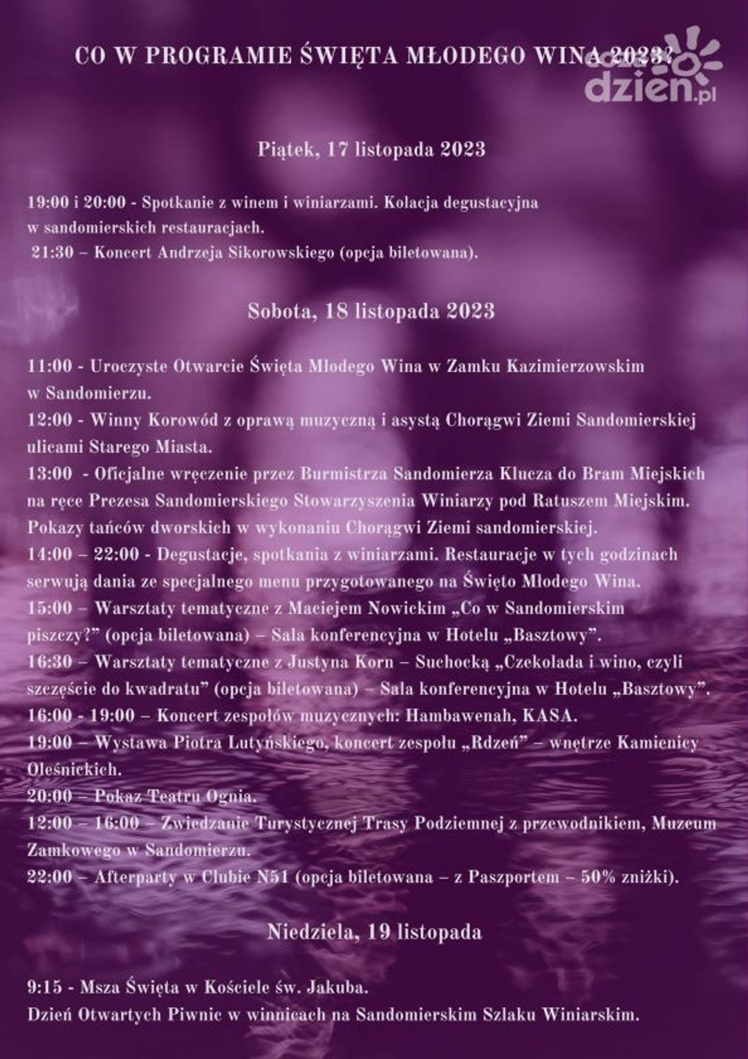 Święto Młodego Wina rozpocznie się w sobotę, 19 listopada o godzinie 11 uroczystym otwarciem w sandomierskim Zamku Kazimierzowskim. W samo południe z jego dziedzińca ruszy barwny korowód wiodący pod ratusz, gdzie władze miasta przekażą winiarzom klucz do miasta. Będzie to widowiskowe wydarzenie, oznaczające symboliczne wejściem winiarzy i enoturystów do Sandomierza.