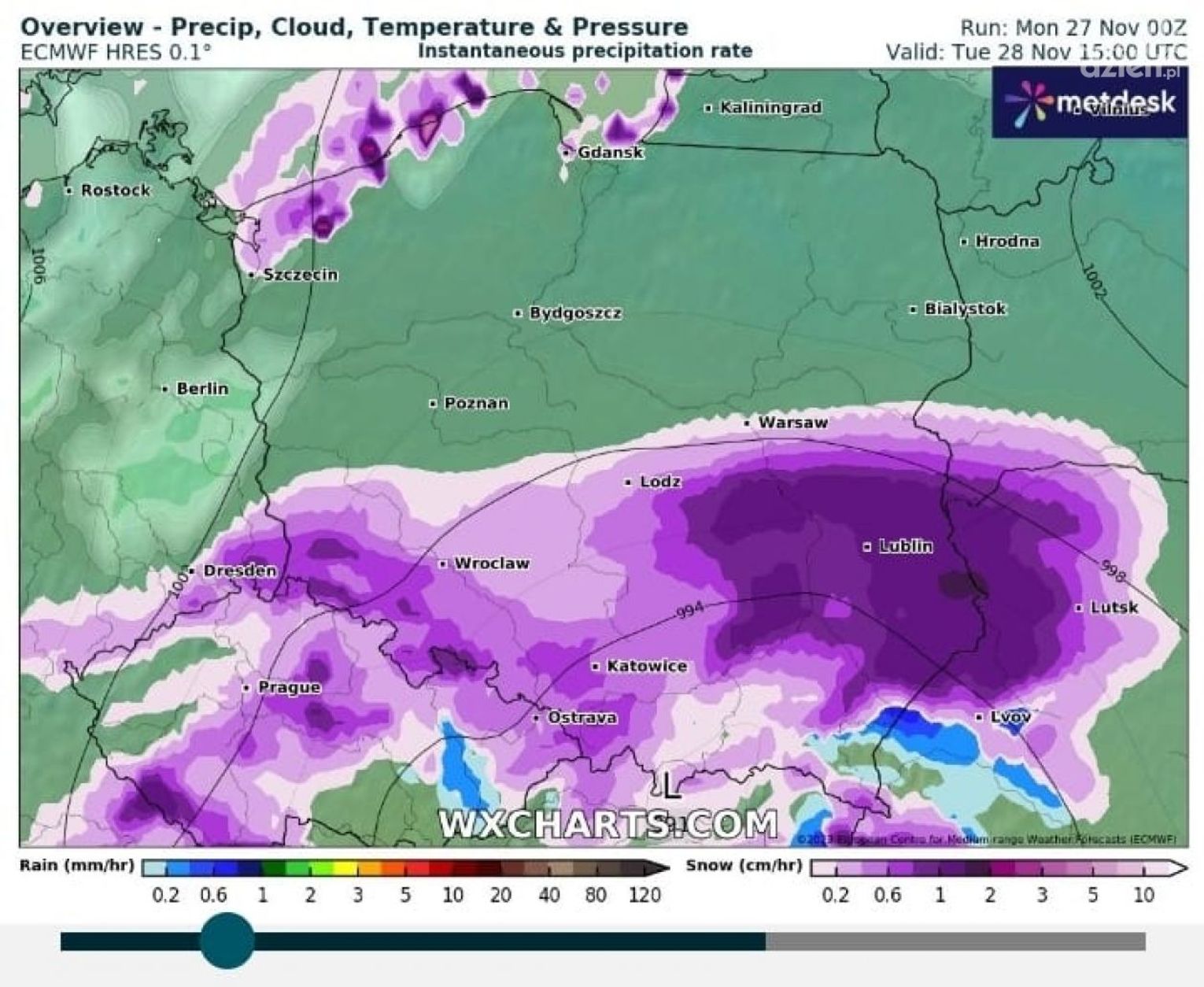 - Z różnym natężeniem padać może przez cały wtorek, opady okresami mogą być dość intensywne. Strefa opadowa powinna opuścić region w godzinach nocnych, czyli w nocy z wtorku na środę. Skutkiem opadów może być powstanie pokrywy śnieżnej o grubości 5-10 cm, zwłaszcza na wschodzie i południu regionu, ale także w Górach Świętokrzyskich - ostrzega Wojciech Nadziałek ze Storm Chasers Świętokrzyskie.