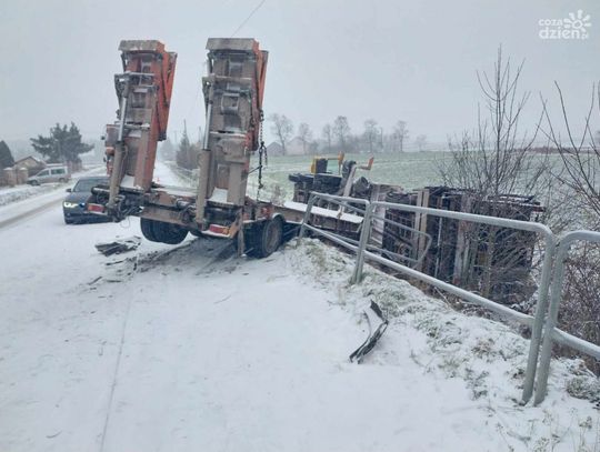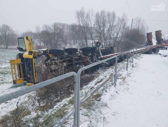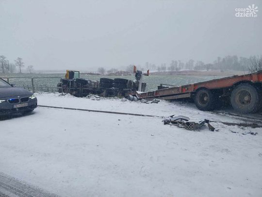 Kierowca TIR-a z obrażeniami ciała trafił do szpitala. Droga w miejscu zdarzenia jest częściowo zablokowana. Policjanci kierują ruchem wahadłowo.