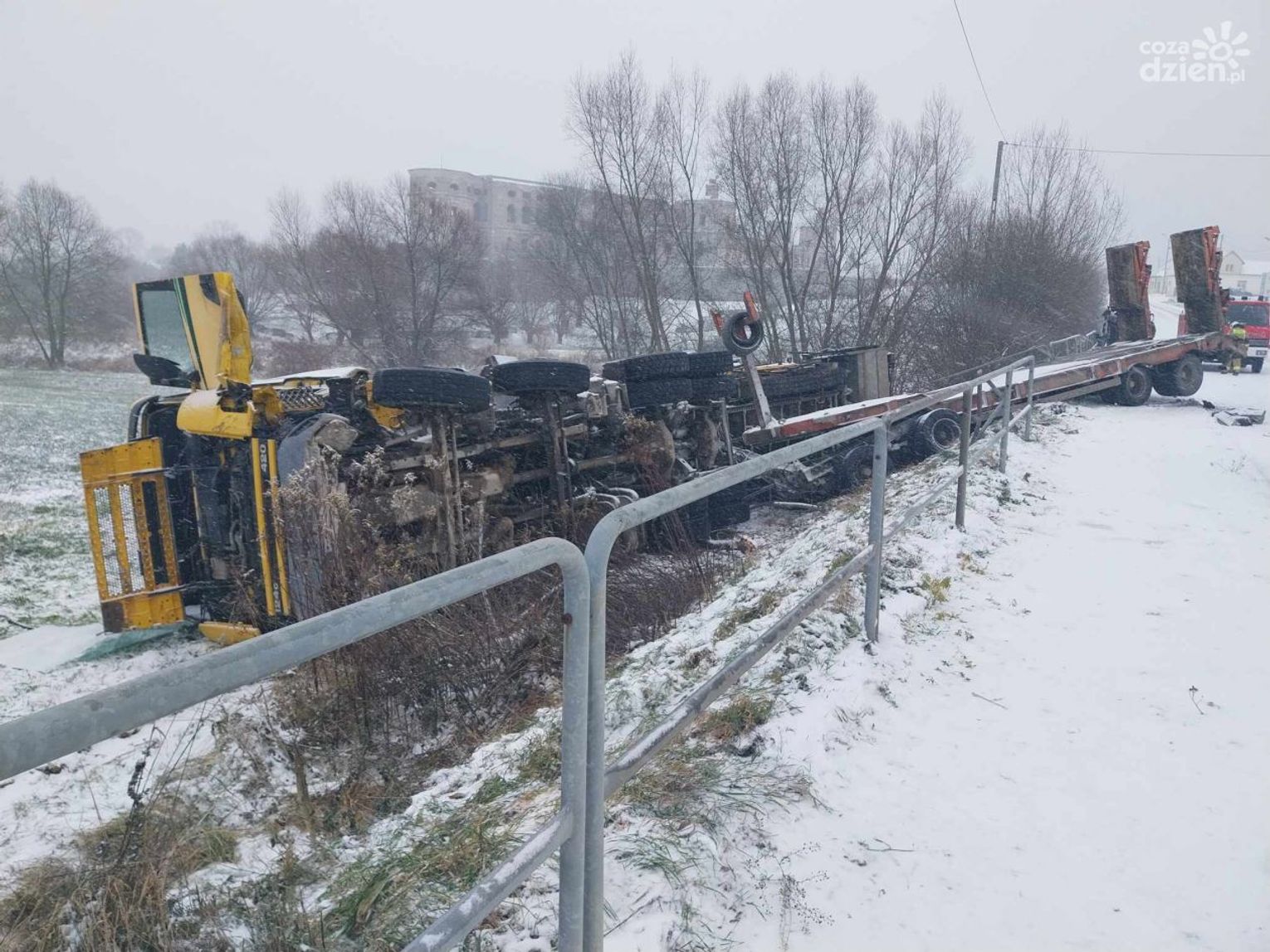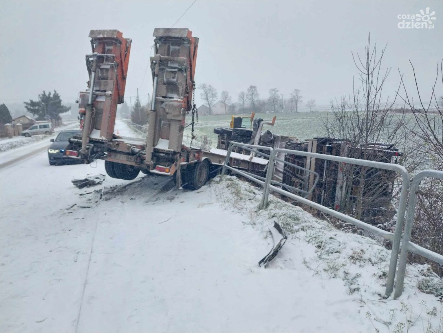 W ciągu Drogi Wojewódzkiej 758 prowadzącej z Iwanisk do Koprzywnicy, w miejscowości Ujazd, pojazd ciężarowy przewożący ciężki sprzęt do budowy dróg wywrócił się do skarpy, przebijając bariery.