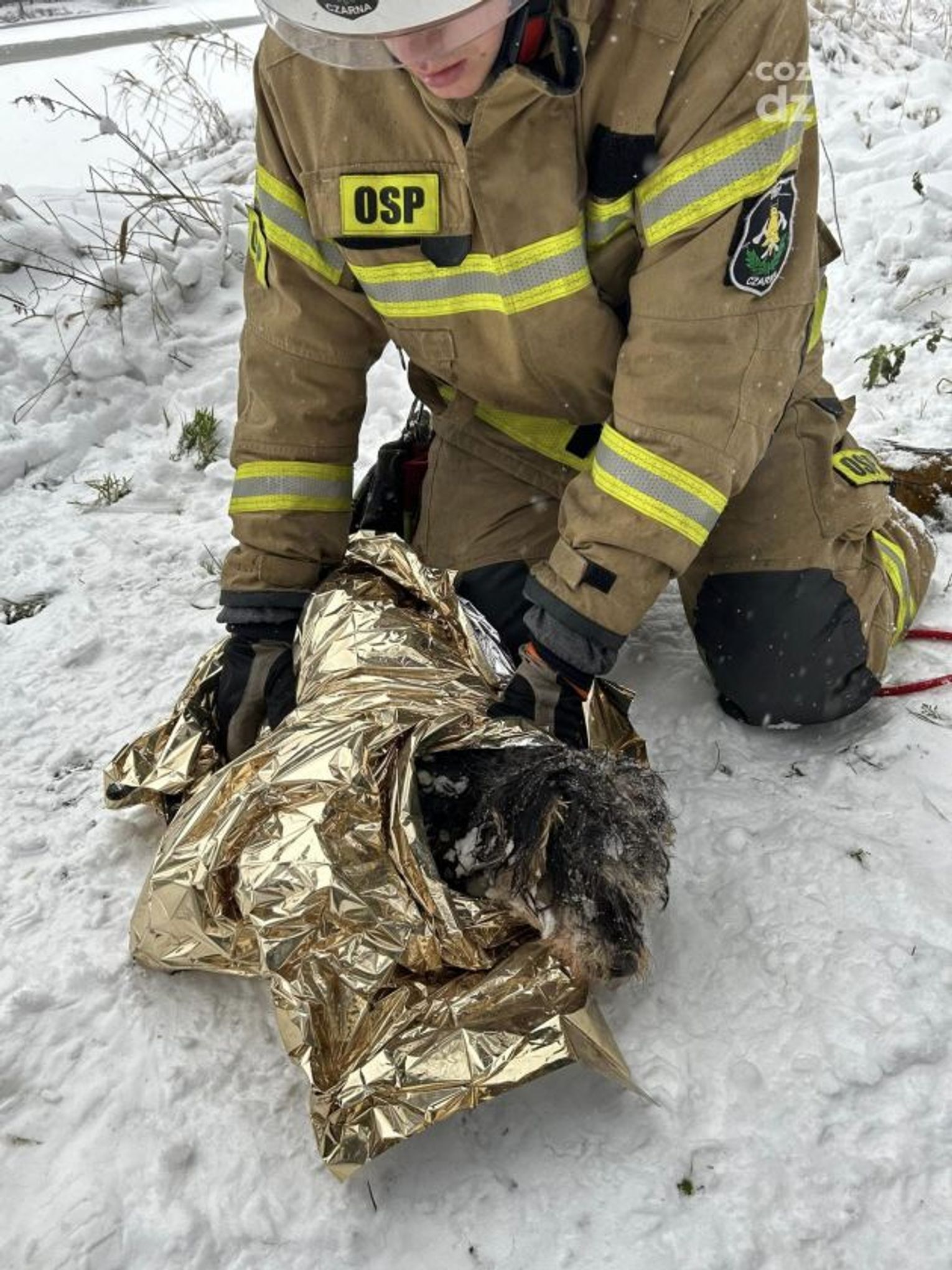 Strażacy z Ochotniczej Straży Pożarnej zostali poinformowani o sytuacji. Na środku zalewu tej samej miejscowości, walczył o przetrwanie pies. Wpadł on do wody z powodu cienkiej miejscami warstwy lodu jaka utworzyła się na wodzie. Strażacy z OSP wraz z Jednostką Ratunkowo - Gaśniczą z Końskich ewakuowali psa. Wykorzystali do tego celu sanie lodowe oraz specjalne procedury. Wychłodzone zwierzę zostało pod opieką strażaków do czasu przyjazdu weterynarza.