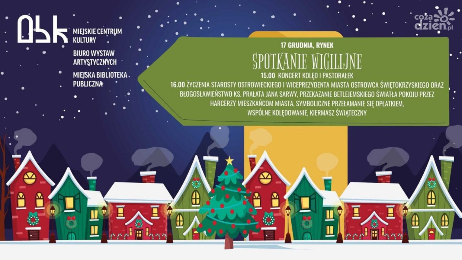 Spotkanie wigilijne, które odbędzie się 17 grudnia 2023 r. na Rynku Ostrowca. Rozpoczęcie zaplanowano na godz. 15.00 koncertem kolęd i pastorałek.