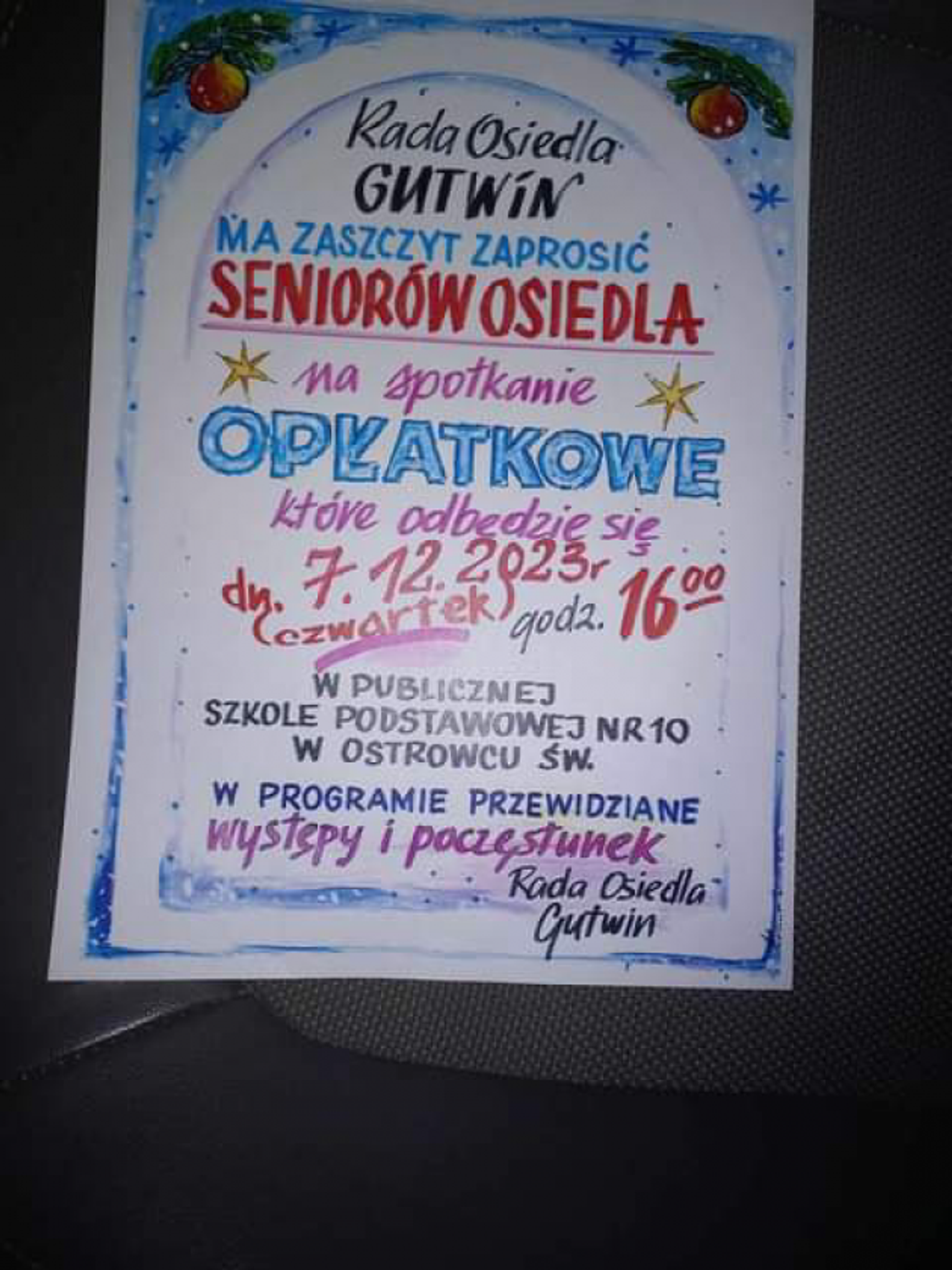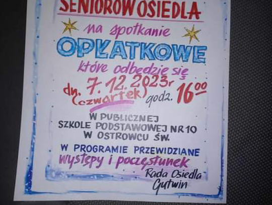 Rada Osiedla Gutwin w Ostrowcu organizuje spotkanie opłatkowe dla swoich mieszkańców. Odbędzie się ono w czwartek, 7 grudnia o godzinie 16 w budynku szkoły podstawowej nr 10.