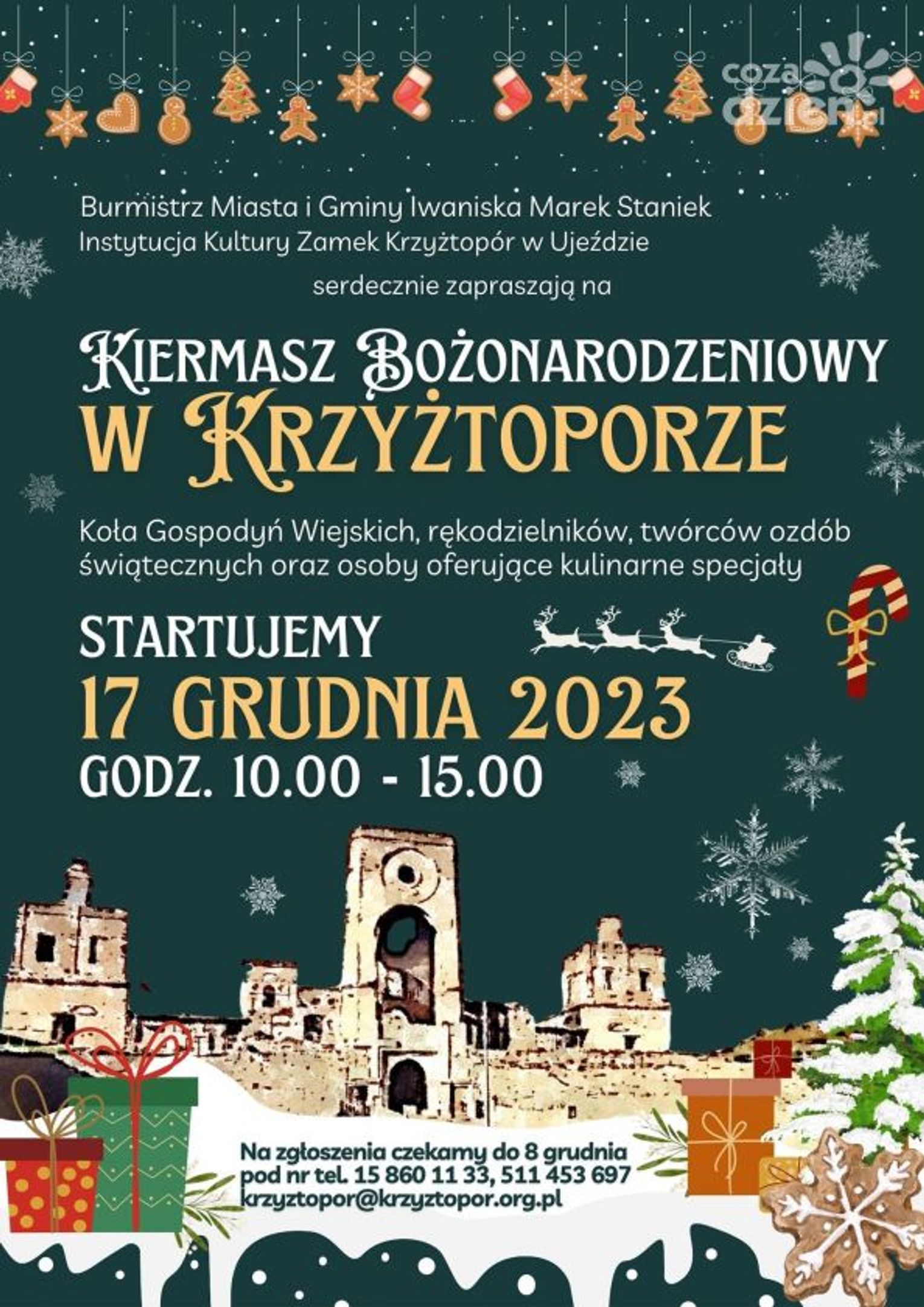 Przedświąteczny kiermasz odbędzie się również w gminie Iwaniska a dokładniej w tamtejszym zamku Krzyżtopór. Kiermasz połączony z przedświątecznymi atrakcjami, jak występy dzieci czy wspólne śpiewanie kolęd rozpocznie się o godzinie 10 i potrwa do 15. A wszystko to oczywiście w zamku Krzyżtopór w Ujeździe w gminie Iwaniska.