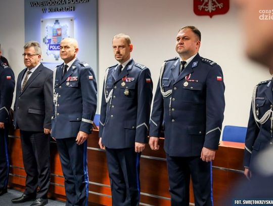 W uroczystej zbiórce związanej ze zmianą na stanowisku szefa świętokrzyskich policjantów wziął udział pełniący obowiązki Komendanta Głównego Policji insp. Marek Boroń, który przyjął dziś meldunki nadinsp. dr. Jarosława Kalety oraz insp. Grzegorza Napiórkowskiego o zdaniu i objęciu obowiązków na stanowisku Komendanta Wojewódzkiego Policji w Kielcach. Wśród zaproszonych gości nie mogło zabraknąć przedstawicieli władz oraz samorządów – na sali obecny był Wojewoda Świętokrzyski Pan Józef Bryk, Prezydent Miasta Kielce Pan Bogdan Wenta, Starosta Jędrzejowski Pan Paweł Faryna. Obecny był także Komendant Wojewódzki Policji w Opolu nadinsp. dr Rafał Kochańczyk oraz przedstawiciele zaprzyjaźnionych służb mundurowych: Komendant Karpackiego Oddziału Straży Granicznej gen. bryg. SG Stanisław Laciuga oraz Świętokrzyski Komendant Wojewódzki Państwowej Straży Pożarnej w Kielcach nadbryg. Krzystof Ciosek, Szef Oddziału Zamiejscowego Centralnego Wojskowego Centrum Rekrutacji w Kielcach płk. Jarosław Molisak oraz przedstawiciele współpracujących instytucji i wymiaru sprawiedliwości. Wśród zebranych przedstawicieli kierownictwa świętokrzyskiej Policji byli zastępcy komendanta wojewódzkiego, komendant miejski i komendanci powiatowi, naczelnicy wydziałów, przedstawiciele związków zawodowych, policjanci i pracownicy komendy. Obecny był także Ksiądz Biskup Diecezji Kieleckiej dr Jan Piotrowski oraz Biskup Marian Florczyk.