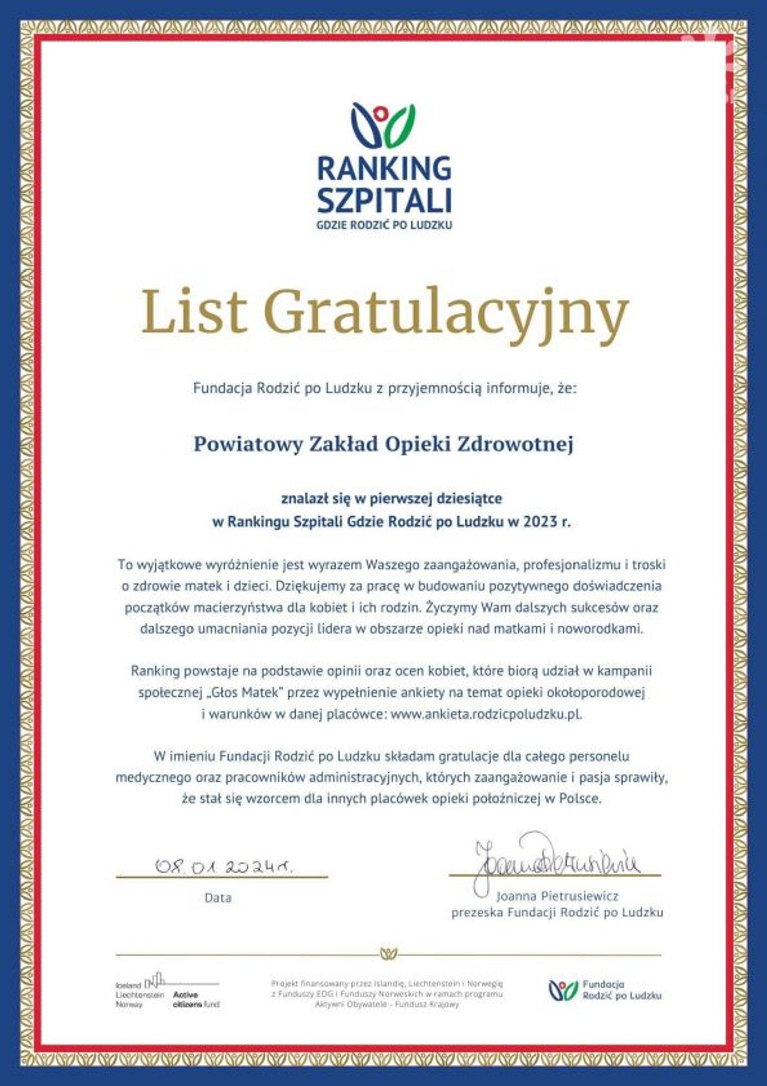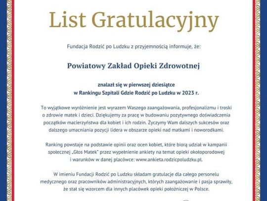 Fundacja "Rodzić po Ludzku" po raz kolejny wyróżniła najlepsze szpitale położnicze w Polsce. Ranking szpitali powstał na podstawie autentycznych doświadczeń dotyczących opieki okołoporodowej. Dane dostarczane są przez kobiety w anonimowych ankietach. W roku 2023 ankiety wypełniło ponad 16 tys. kobiet.