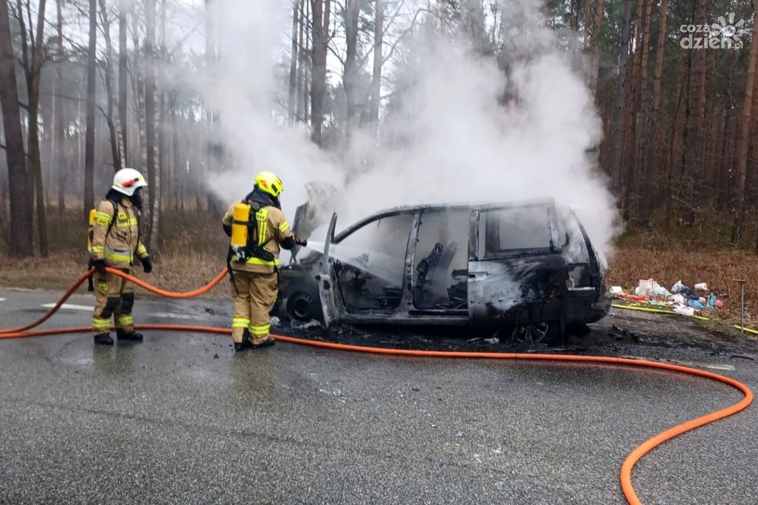 Samochód spłonął doszczętnie, strażacy dogasili wrak i zabezpieczyli miejsce zdarzenia.