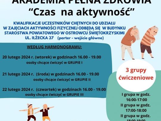 Kwalifikacje uczestników będą odbywać się w siedzibie ostrowieckiego starostwa przy ulicy Iłżeckiej. Zajęcia będą prowadzone w trzech grupach ćwiczeniowych, pierwsza będzie miała zajęcia od 16 do 17, druga od 17 do 18 a trzecia od 18 do 19.