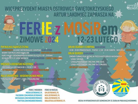 Ferie w Ostrowcu na półmetku Ferie zimowe 2024 w województwie Świętokrzyskim osiągnęły półmetek. Na obiektach Miejskiego Ośrodka Sportu i Rekreacji w Ostrowcu Świętokrzyskim w pierwszym tygodniu dużo się działo. Atrakcji nie zabraknie również w drugim tygodniu. Dla osób, które nie wyjechały na zorganizowany wypoczynek, decydując się spędzić ferie w Ostrowcu Świętokrzyskim, MOSiR tradycyjnie przygotował różne propozycje na spędzenie tego czasu w sposób aktywny. Udział w niektórych z tych propozycji jest całkowicie bezpłatny, z innych można skorzystać w specjalnej promocyjnej cenie, a przy okazaniu Ostrowieckiej Karty Mieszkańca (tzw. OstraKarta) promocyjne ceny można jeszcze bardziej pomniejszać.