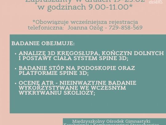W czasie ferii, a dokładnie do 23 lutego Międzyszkolnym Ośrodku Gimnastyki Korekcyjnej i Kompensacyjnej w Starachowicach oferuje możliwość wykonania takich badań u dzieci i młodzieży w wieku od 6. do 18. roku życia.
