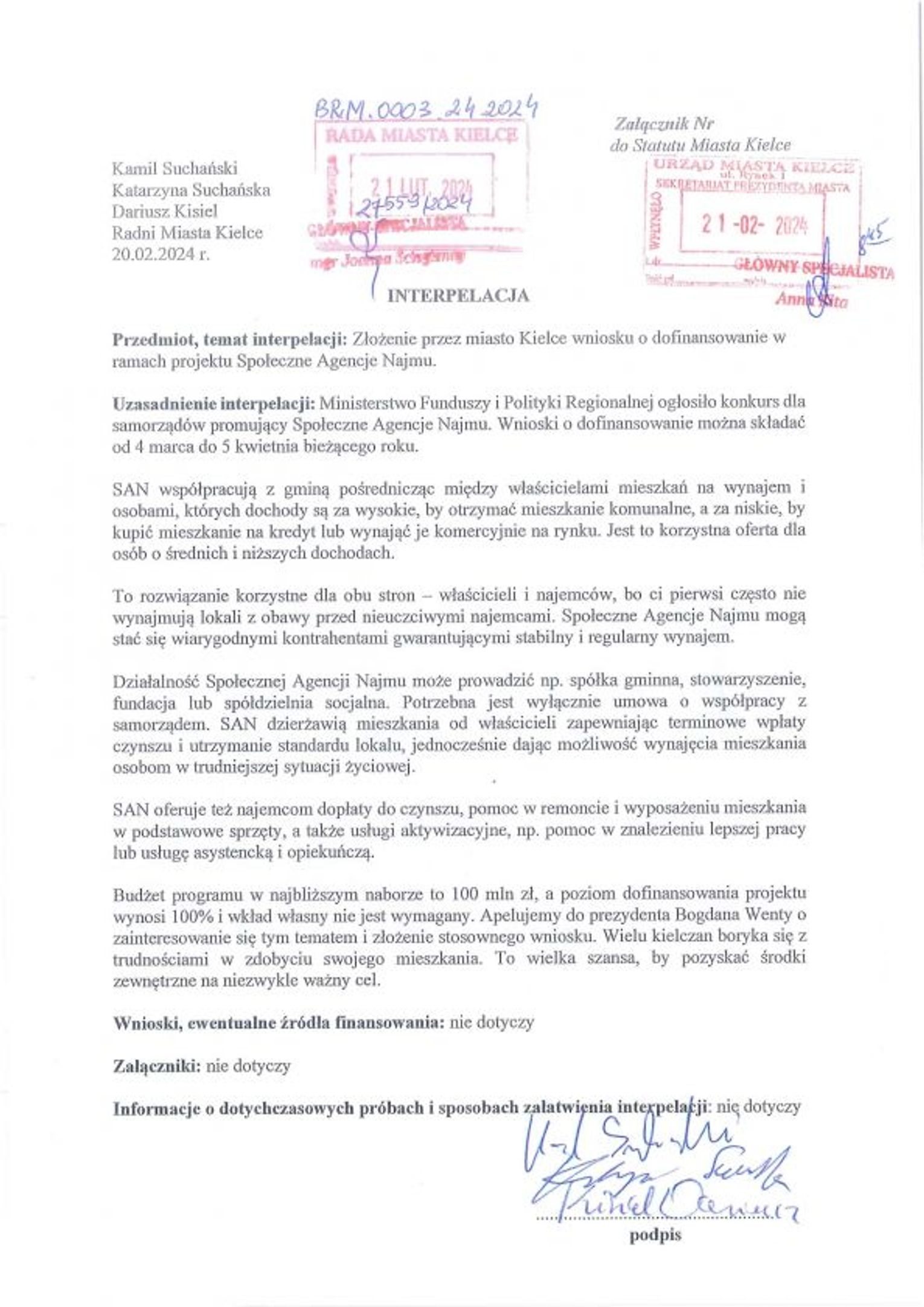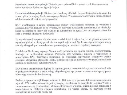 Kamil Suchański złożył w tej sprawie interpelację do prezydenta Kielc Bogdana Wenty. Jak zaznaczył, Społeczne Agencje Najmu współpracują z gminą pośrednicząc między właścicielami mieszkań na wynajem i osobami, których dochody są za wysokie, by otrzymać mieszkanie komunalne, a za niskie, by kupić mieszkanie na kredyt lub wynająć je komercyjnie na rynku.