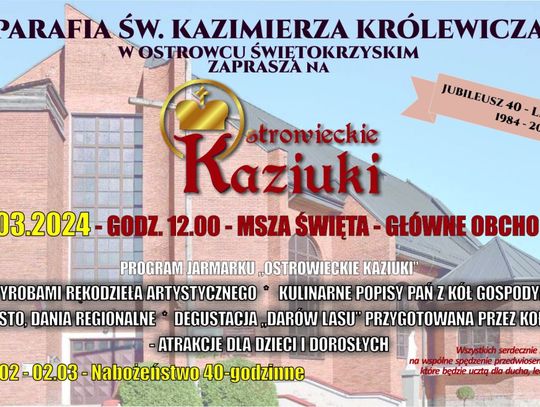 Natomiast na przykościelnym dziedzińcu odbywać się będzie jarmark „Ostrowieckie Kaziuki”. Będą stoiska z wyrobami rękodzieła artystycznego, kulinaria przygotowane przez panie z Kół Gospodyń Wiejskich w tym domowe ciasta i dania regionalne. Będzie też degustacja darów lasu przygotowanych przez Koła Łowieckie. Nie zabraknie też atrakcji dla dzieci i dorosłych.