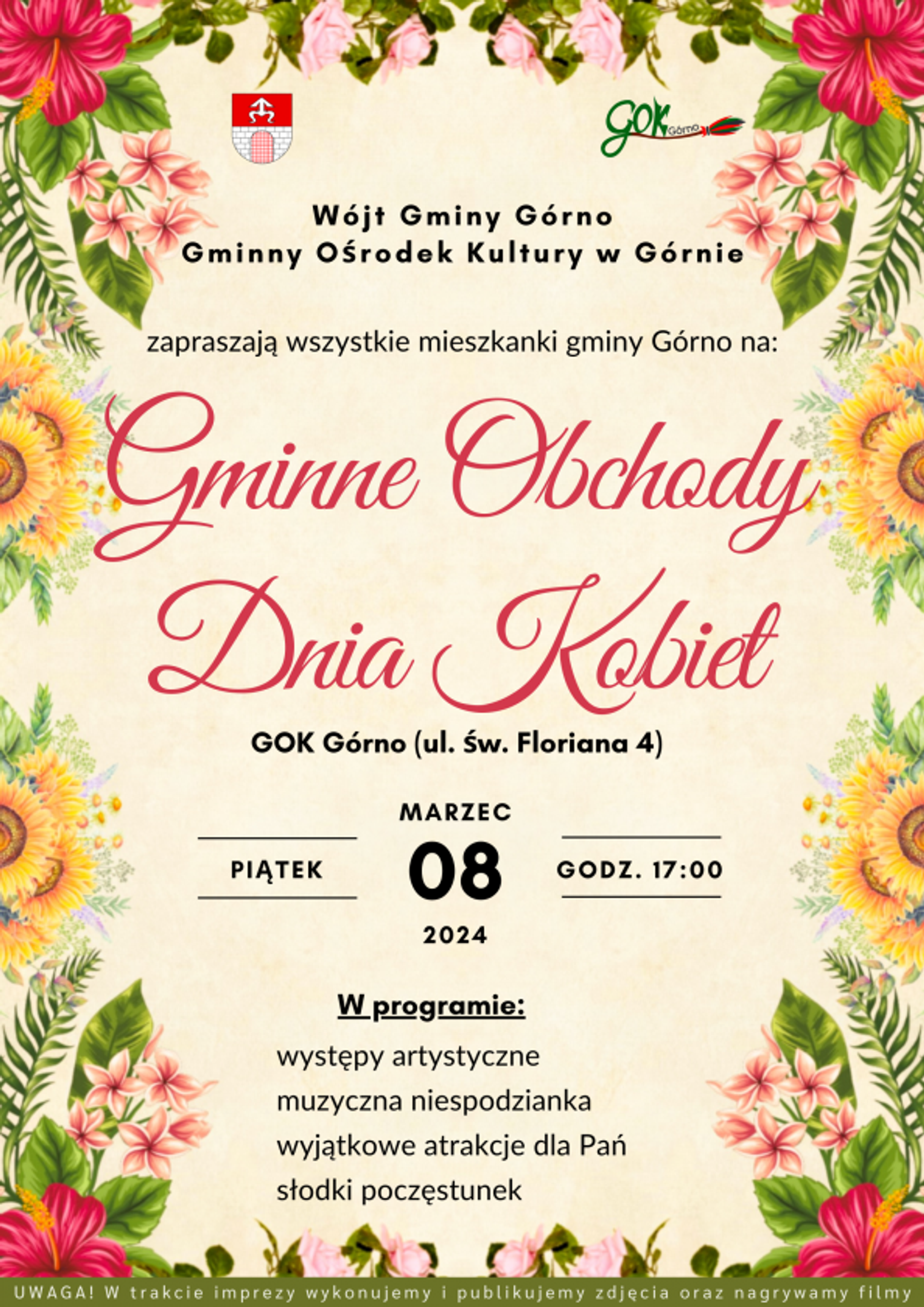 W związku z tym, wójt Przemysław Łysak serdecznie zaprasza mieszkanki gminy Górno na wspólną zabawę w tym dniu. Wspólne świętowanie rozpocznie się 08.03.2024r. o godz. 17:00 w budynku GOK w Górnie (ul. św. Floriana 4).