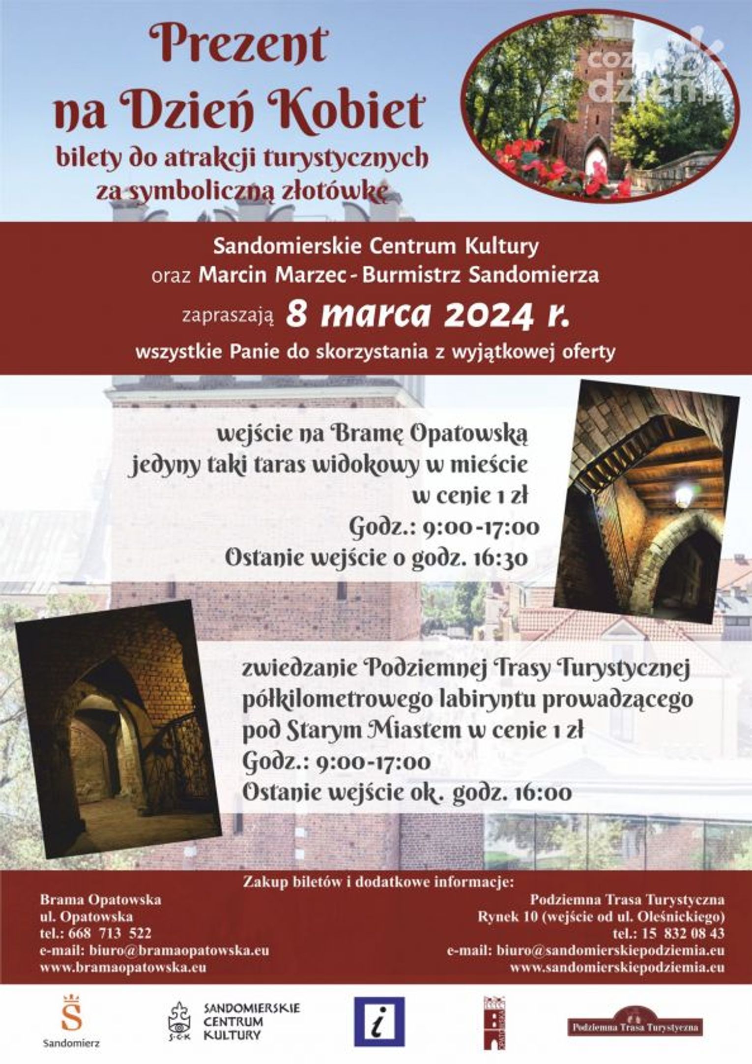 Tylko dzisiaj, czyli 8 marca wszystkie Panie będą mogły zwiedzić sandomierskie perły turystyczne, czyli Bramę Opatowską i Podziemną Trasę Turystyczną, jedynie za symboliczną złotówkę.
