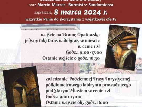 Zarówno wejście na Bramę Opatowską w Sandomierzu jak i Zwiedzanie podziemi odbędzie się za symboliczną złotówkę Warto, by panowie skłonili się na gest wobec kobiet i zabrali je na wspaniały spacer po mieście.