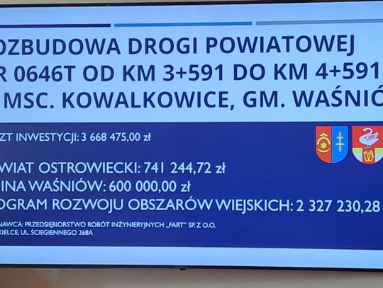 Według umowy droga ma powstać do stycznia przyszłego roku, jednak wykonawca deklaruje wcześniejsze zakończenie robót. Inwestycja będzie kosztowała prawie 3,7 mln zł, z czego pond 60 procent to unijne dofinansowanie a pozostał kwota czyli po ponad 600 tysięcy wyłożą solidarnie powiat ostrowiecki i gmina Waśniów.