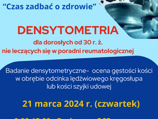Bezpłatne badania densytometryczne, czyli określające stan gęstości kości będą mogli wykonać mieszkańcy powiatu ostrowieckiego. Z tych bezpłatnych badań będą mogły skorzystać osoby powyżej 30 roku życia i nie leczące się w poradni reumatologicznej. Badanie będzie obejmowało ocenę gęstości kości w obrębie odcinka lędźwiowego kręgosłupa lub kości szyjki udowej.